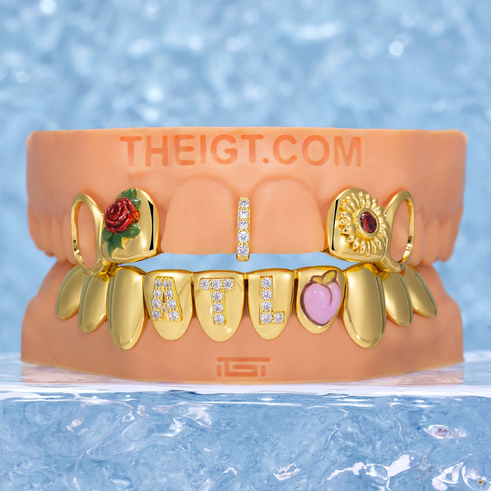 ATL Bloom Grillz showcase enamel rose and peach details with ruby gemstones set in a bloom-inspired design. White moissanite stones spell out ATL letters for a bold, personalized statement. Luxurious and eye-catching—transform your smile into a masterpiece.