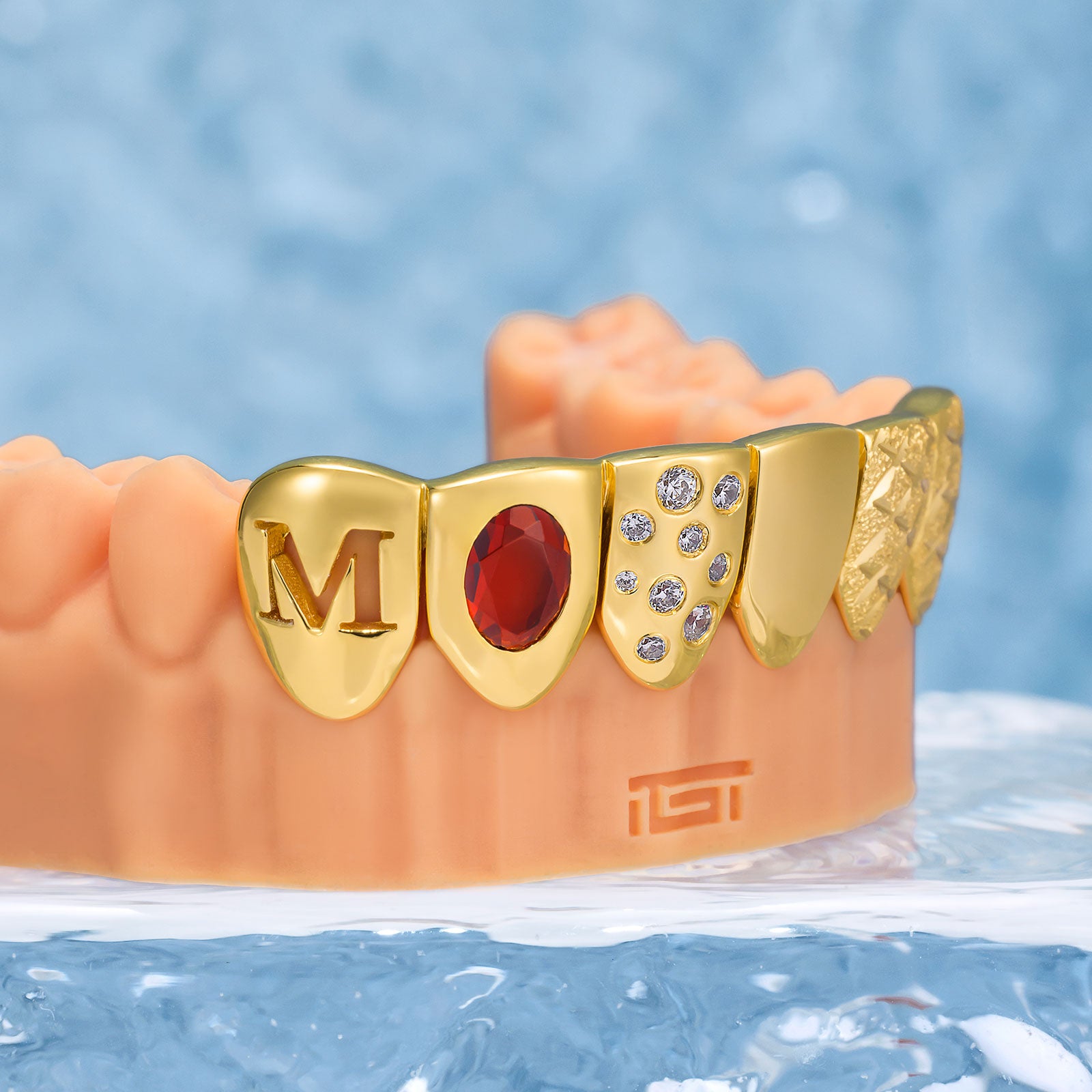 Showcase pure artistry with Ruby & Gold Letter Grillz. One tooth features an intricate hollow letter design, while another gleams with a radiant ruby. A brilliant white moissanite stone completes the set, flanked by two teeth crafted with specialized cutting techniques. Each piece tells a story of precision and luxury.