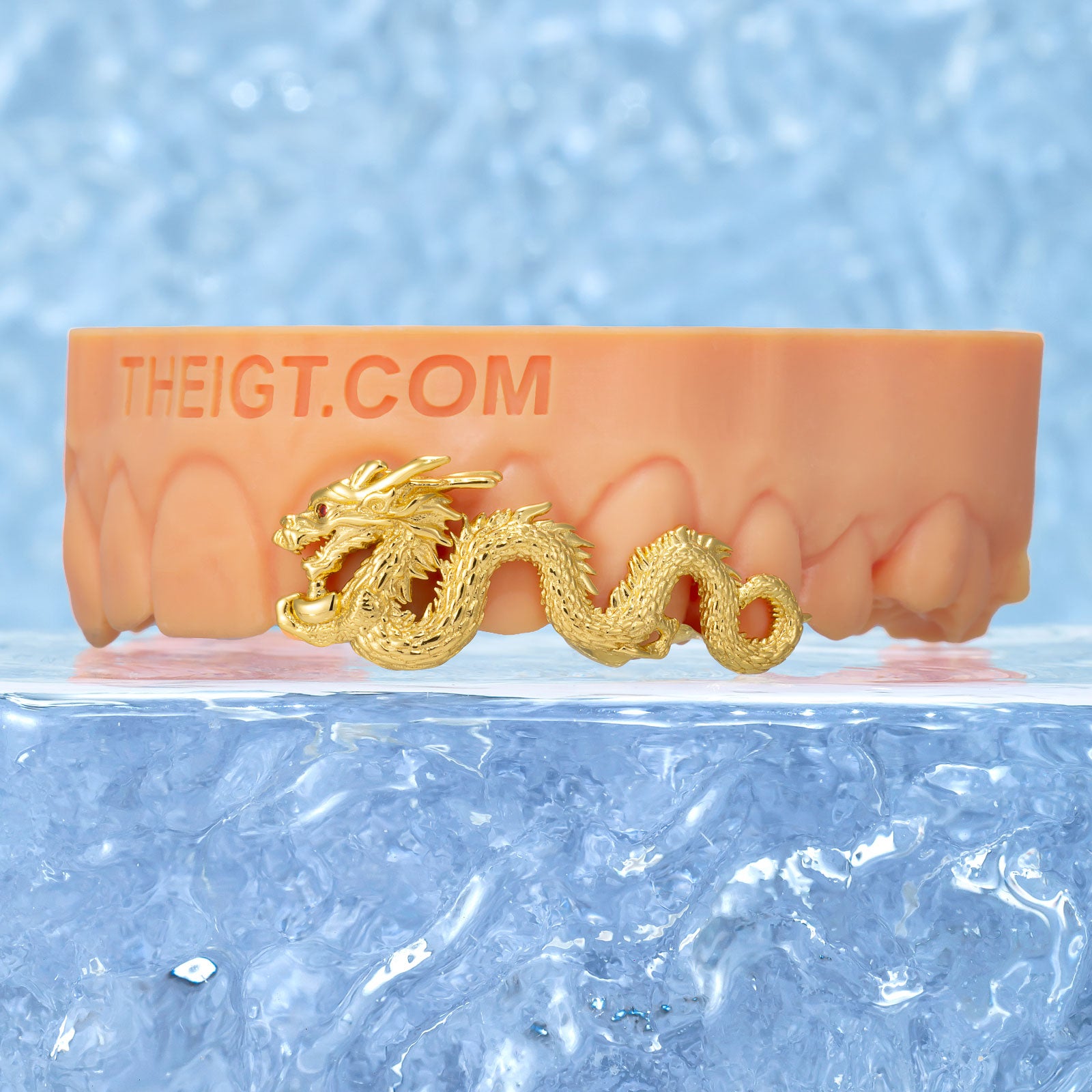 Experience the power of our Golden Dragon Grillz. Intricate scale detailing showcases masterful craftsmanship, while the radiant gold body is crowned with striking ruby eyes. This bold statement piece commands attention and respect. Perfect for collectors and those who refuse to blend in, it's where artistry meets attitude.