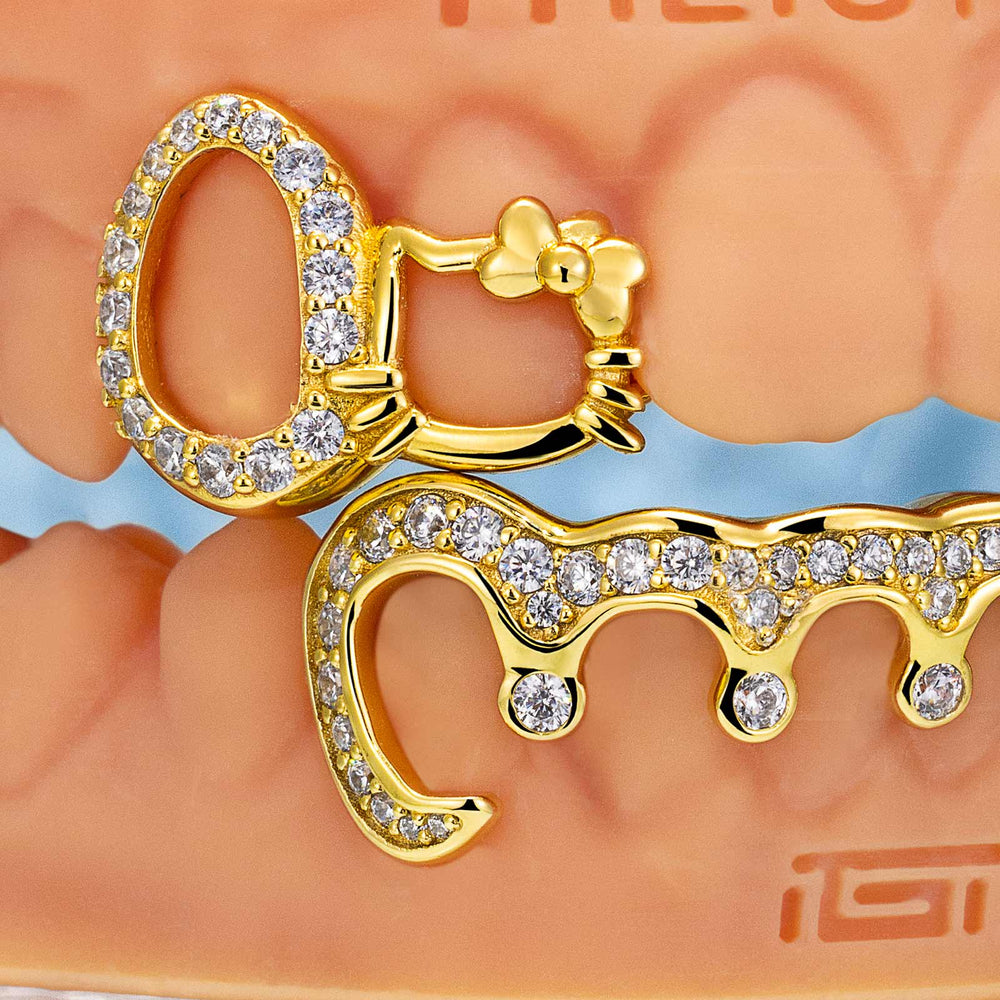 Embrace your unique style with our Kitty & Wave Style Grillz. These eye-catching dental accessories feature iced-out wave patterns alongside adorable solid kitty and heart shapes. Perfect for making a bold fashion statement while showcasing your playful personality. Each piece is crafted to add that extra sparkle to your smile.