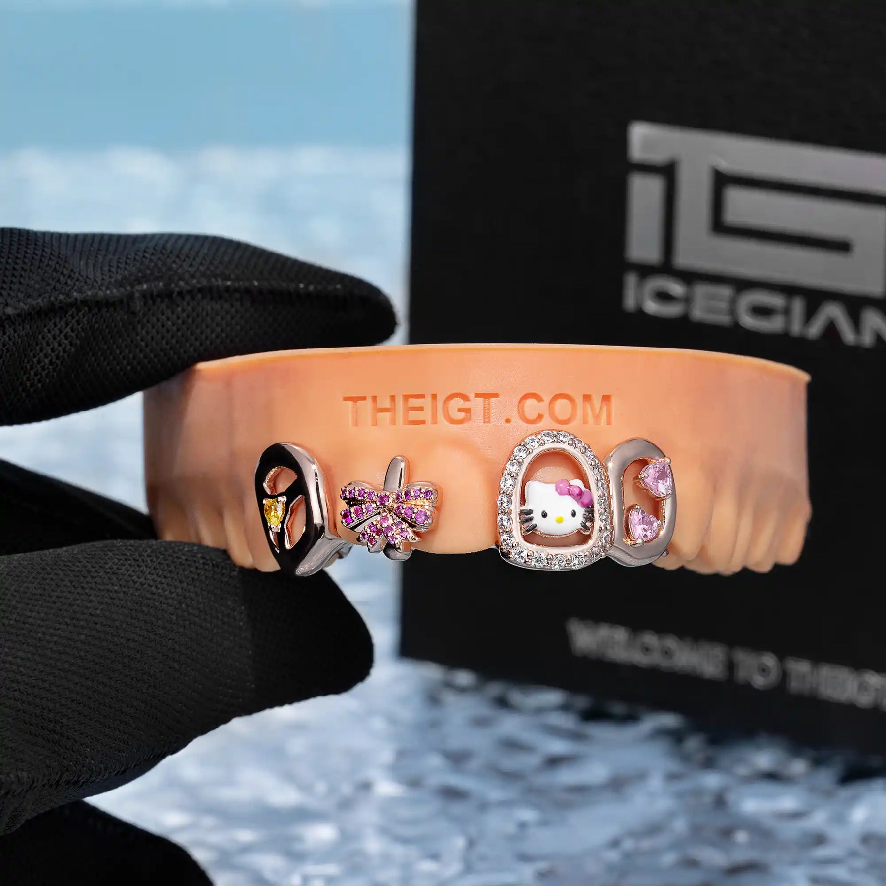 Flaunt your playful side with Kitty's Style Grillz—an open-face design featuring adorable enamel Kitty detailing. Pink heart inlays catch the light while purple stone accents form a charming bow motif. Sweet, sassy, and unmistakably romantic. Perfect for those who dare to sparkle with personality.