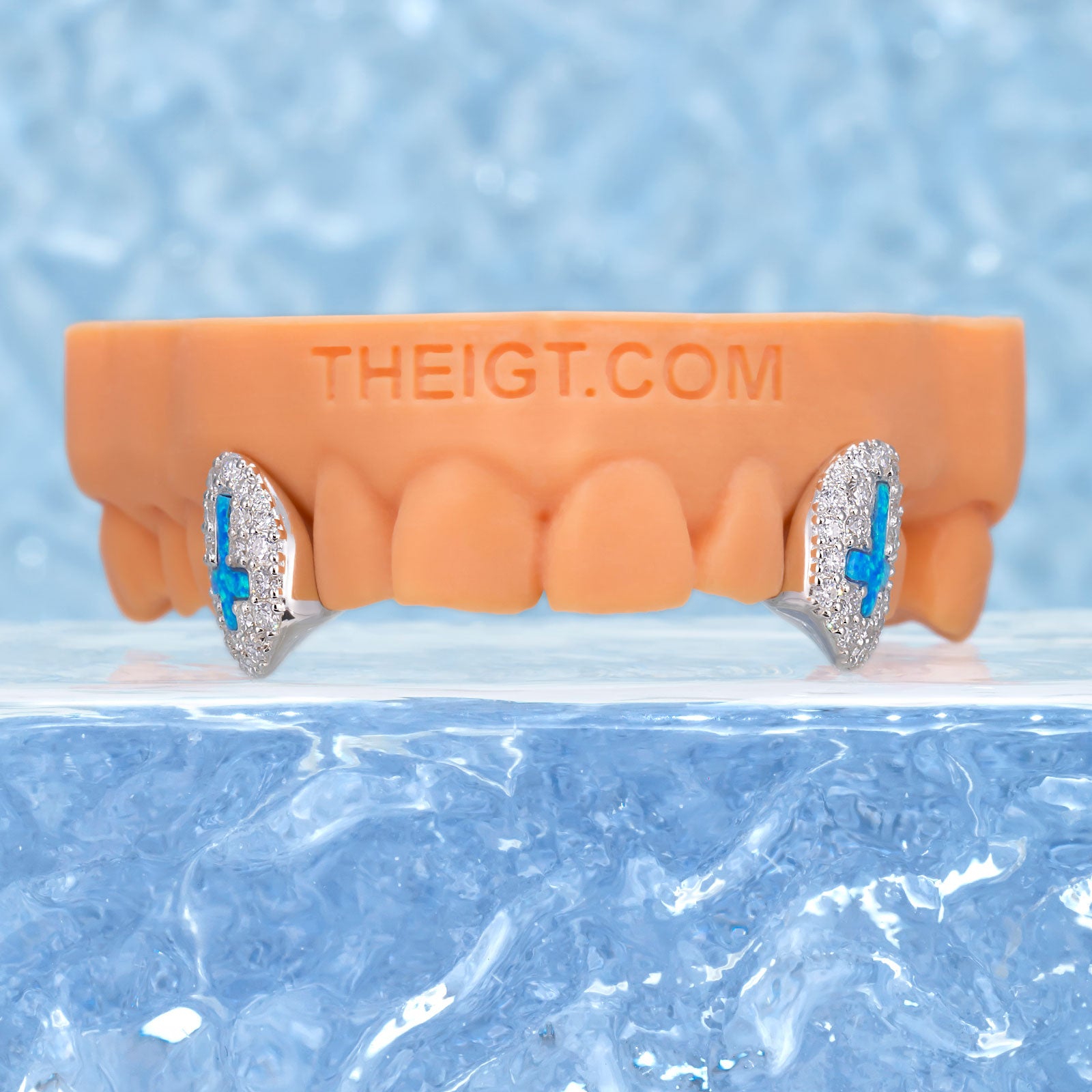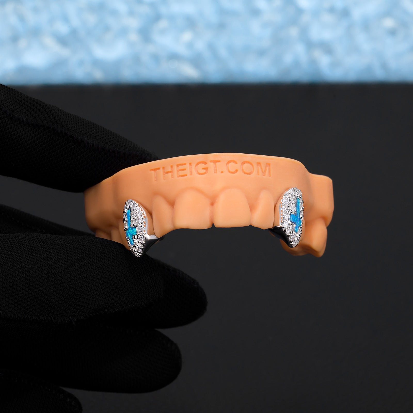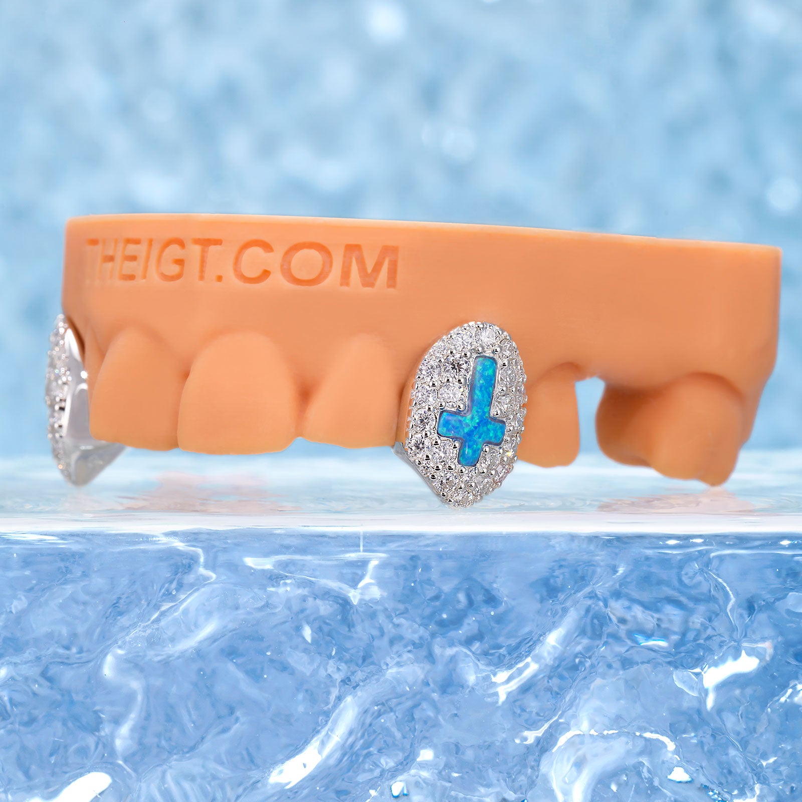 Elevate your smile with these stunning tooth caps featuring a blue opal inverted cross at the center, surrounded by brilliant moissanite stones. The deep, mystical blue opal pairs perfectly with sparkling moissanite, creating an eye-catching luxe look. Ideal for making a bold statement, whether daily wear or special occasions. ICEGIANT's premium craftsmanship ensures exceptional quality and radiance.