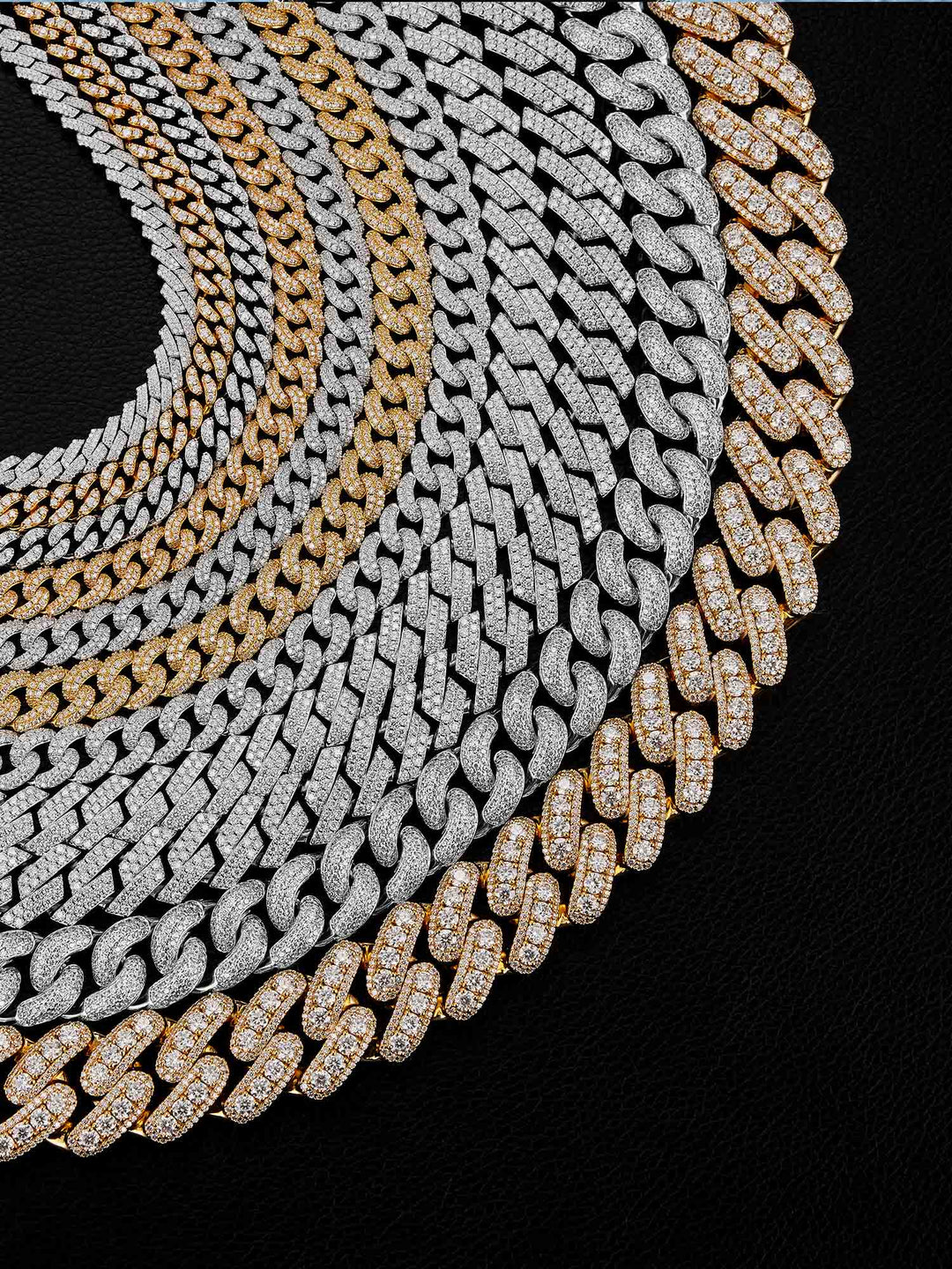 The Cuban Link Chain is an iconic symbol of power, wealth, and street fashion. ICEGIANT's collection focuses on the ultimate "Iced-Out" effect, featuring premium Moissanite or diamond simulants that are guaranteed to pass standard diamond testing, providing exceptional fire and shine. We offer a variety of widths (e.g., 8mm, 12mm, 15mm, 20mm) and metal finishes (classic white gold, luxurious yellow gold, and trendy two-tone) in both necklaces and bracelets. Whether you seek simple single wear or a powerful layered statement, define your luxury attitude here.