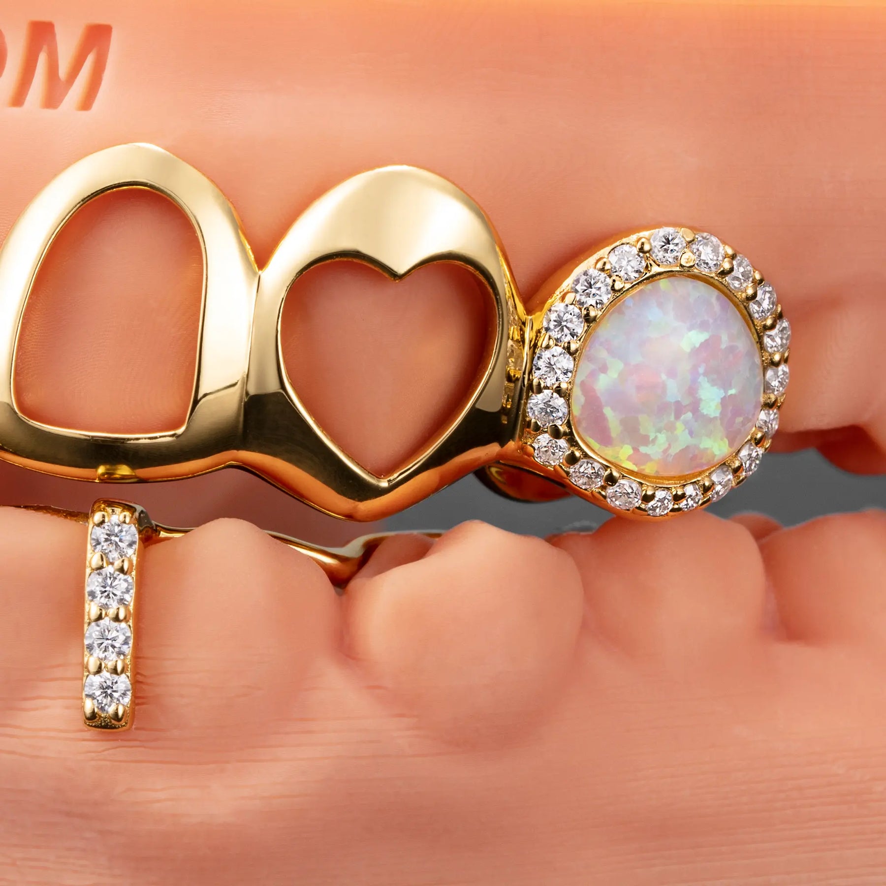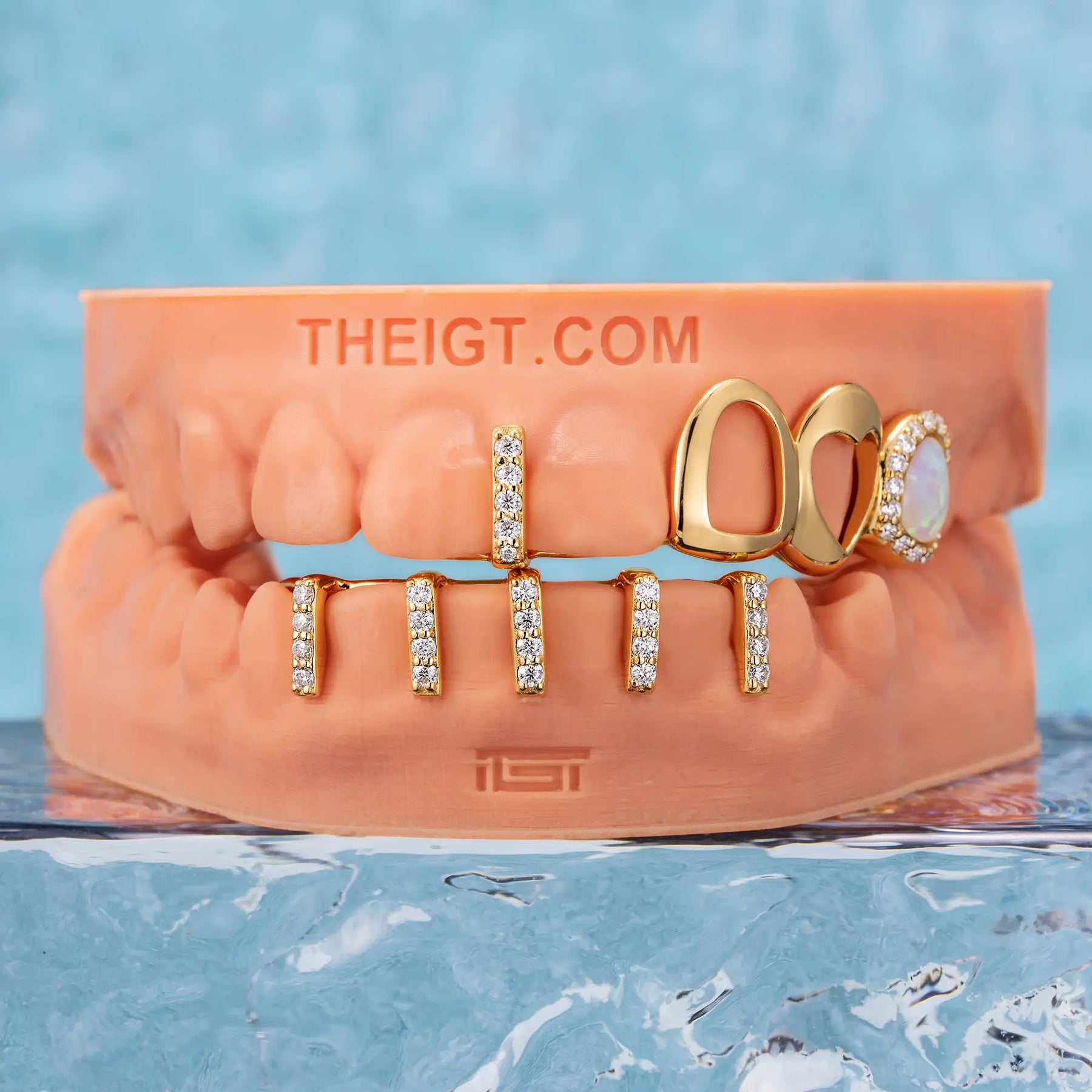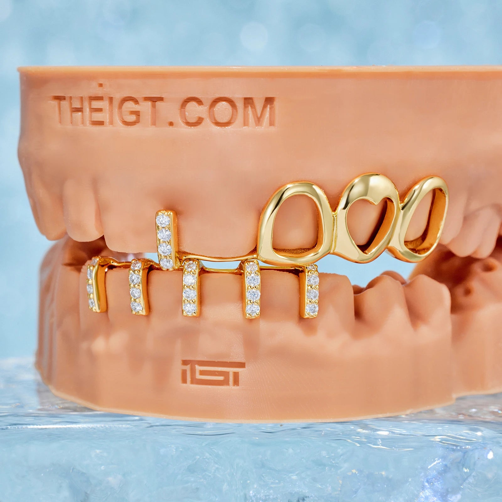 Customize your smile with our open face with diamond gap bar grillz. Handmade for the perfect fit, this design features an open face and a vertical gap bar between the front teeth. Personalize your style with a customized open face shape. Get ready to rock your new look!