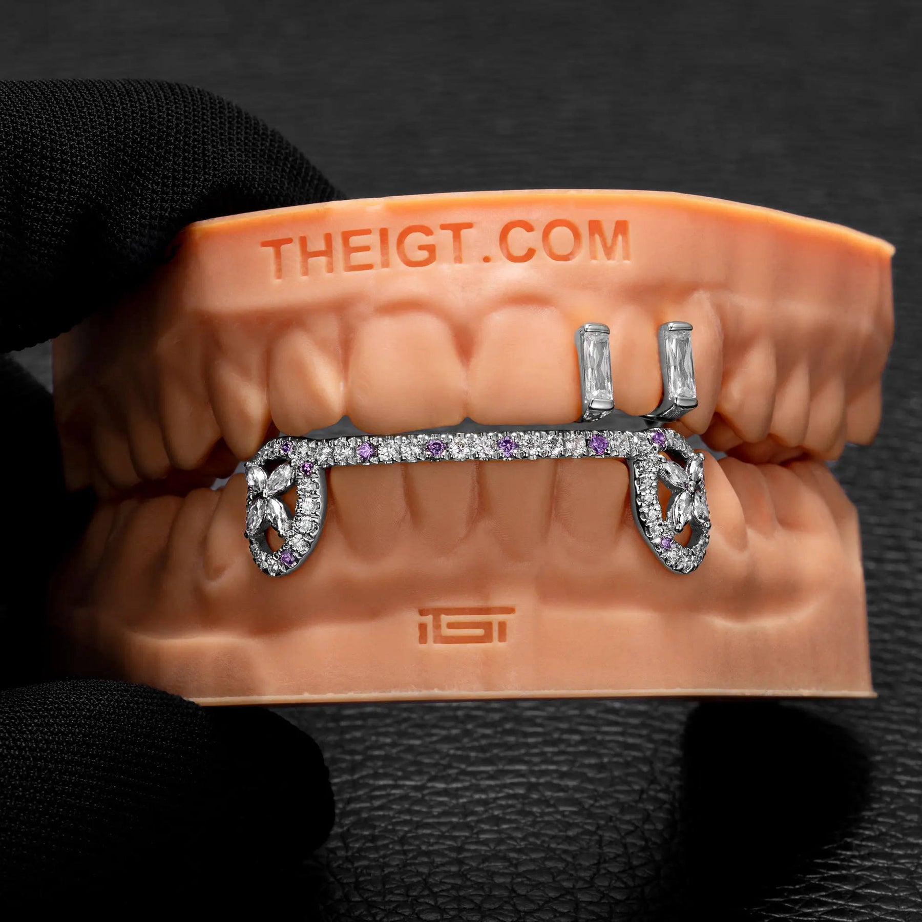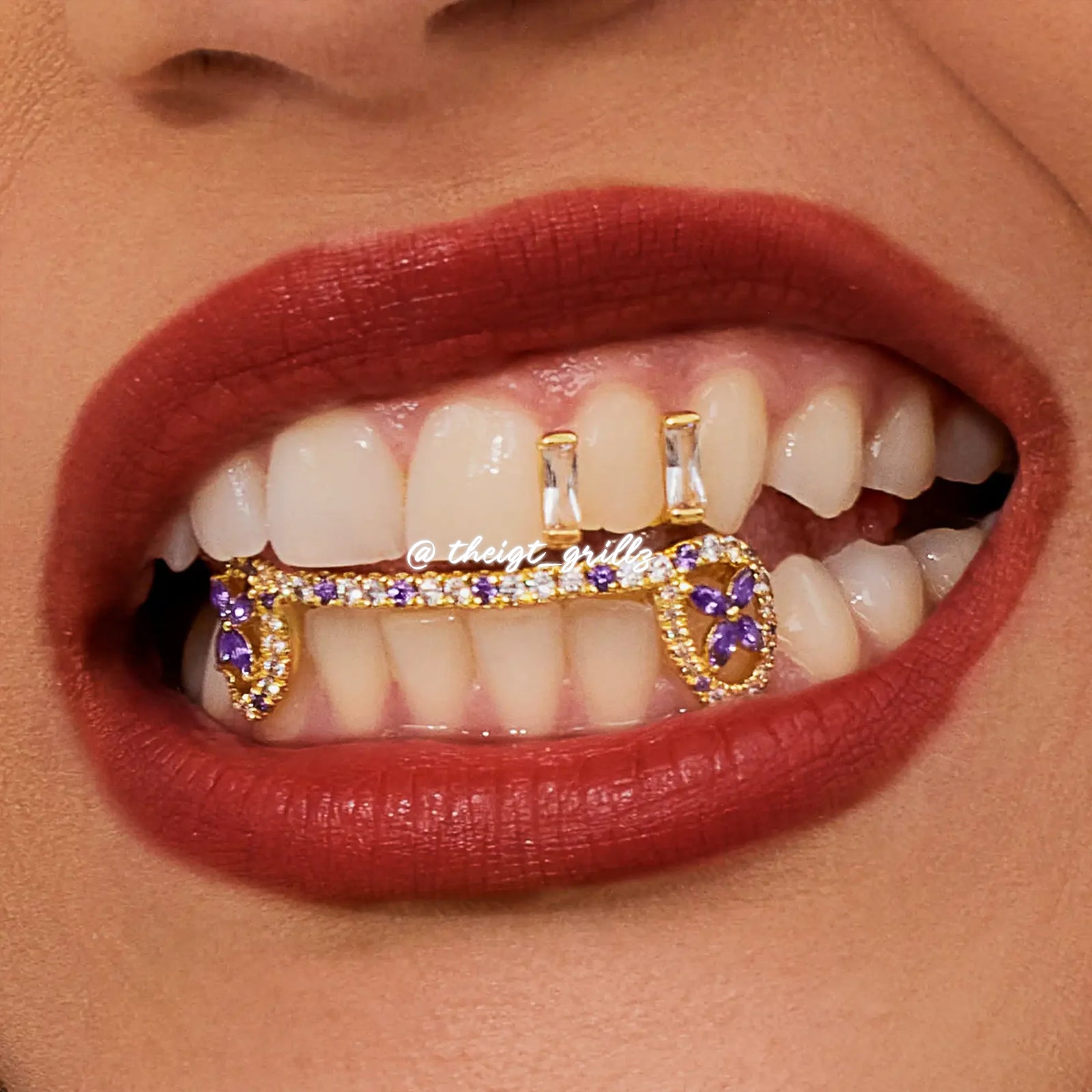 Introducing our customized smile with our top baguette bar with bottom clover fang grillz, the perfect accessory to customize your smile! Handmade for a perfect fit, these grillz feature purple marquise cut stones on the lower canines, alternating white and purple on the bridge for a unique look. Personalize your style with a gap bar design on top teeth and get ready to rock your new look!