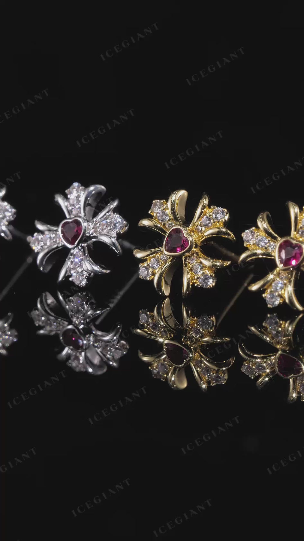 Love at first sparkle! These cross studs blend a rosy heart gem with brilliant moissanite for maximum radiance. Ethically crafted and feather-light, they're your new favorite accessory for adding instant charm to any vibe.