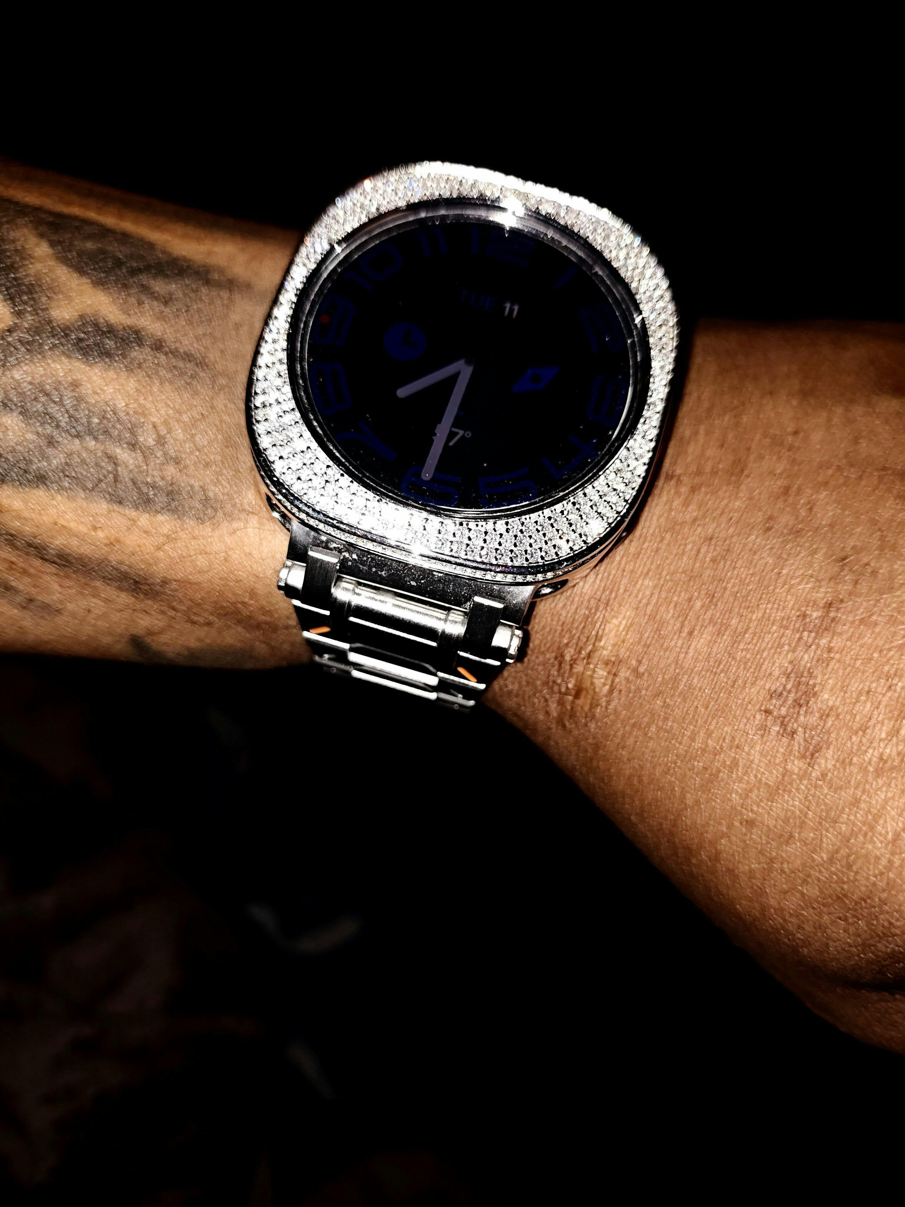 Introducing the 47mm Moissanite Bezel Case Cover For Galaxy Watch Ultra by iCEGIANT. With the latest design and moissanite stone detailing on the sides, elevate the look of your watch while keeping it protected. A must-have for any fashion-forward watch enthusiast.