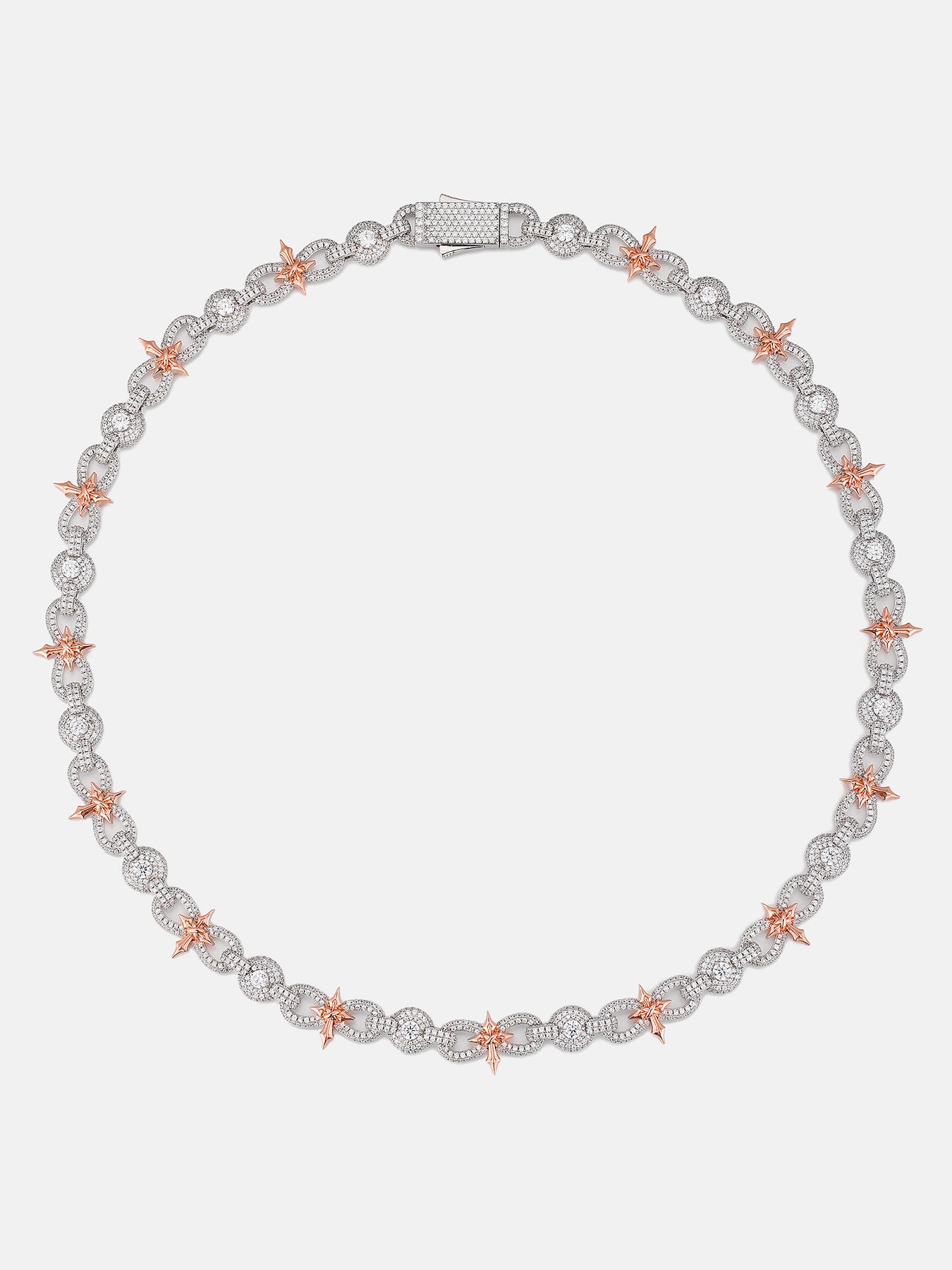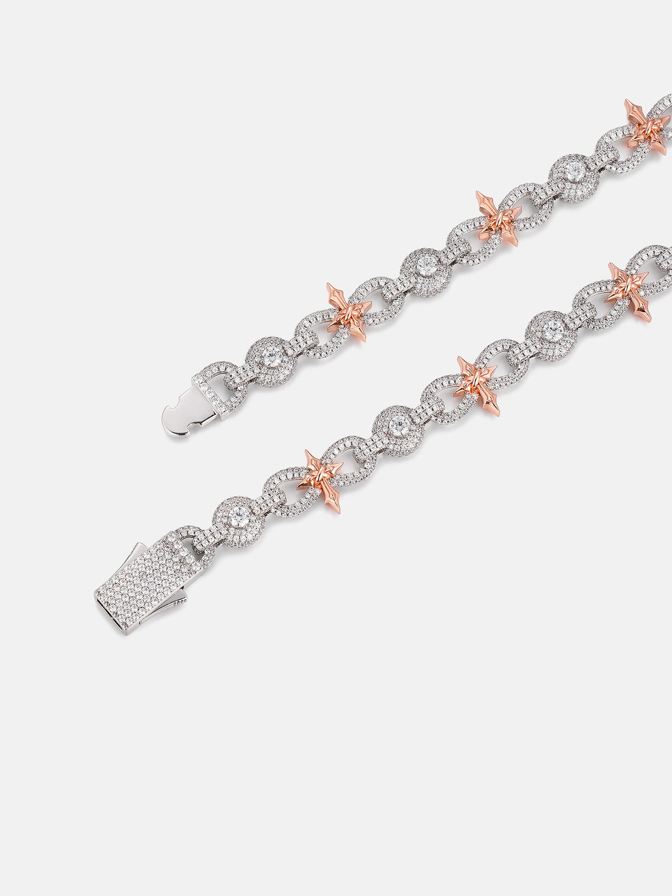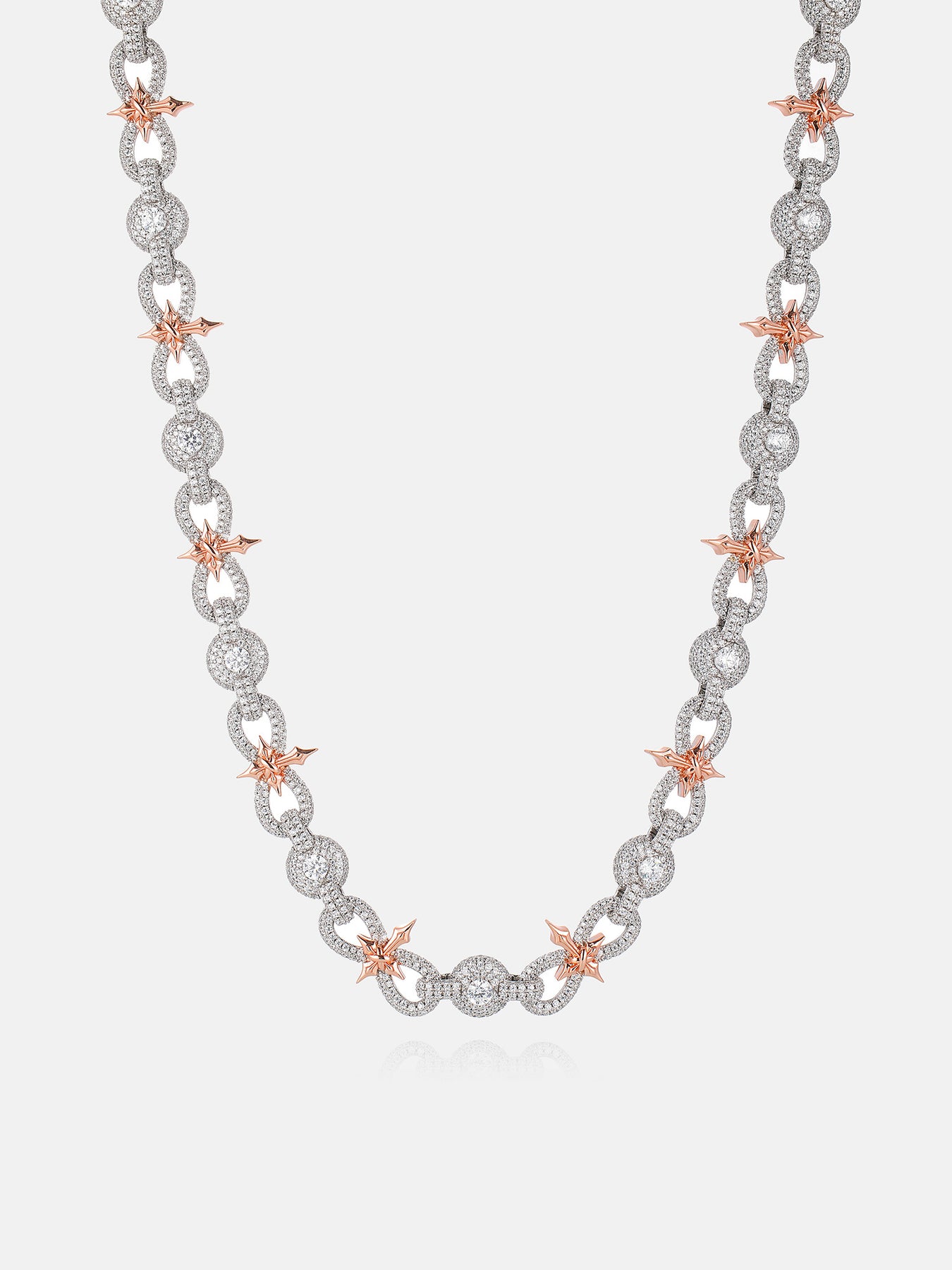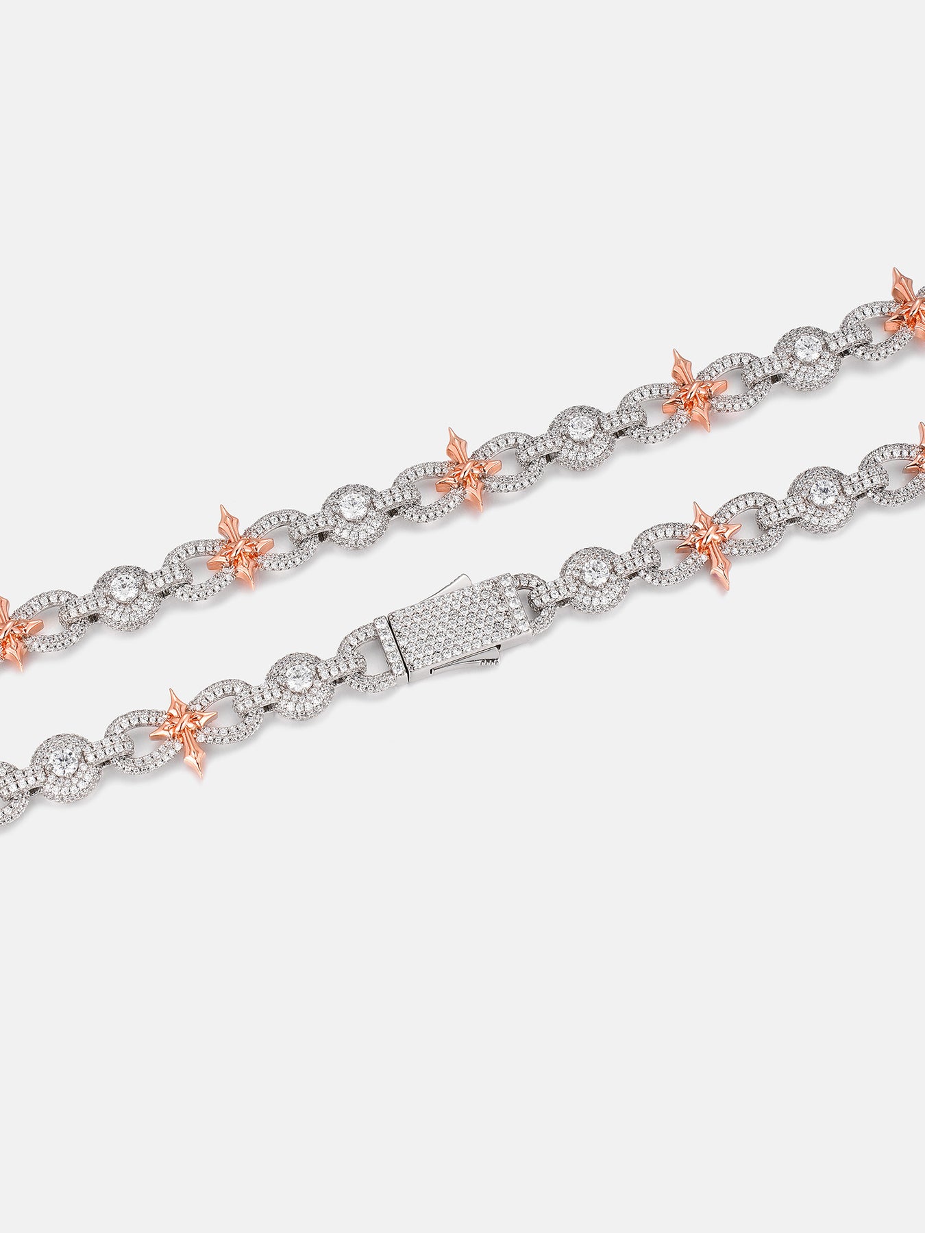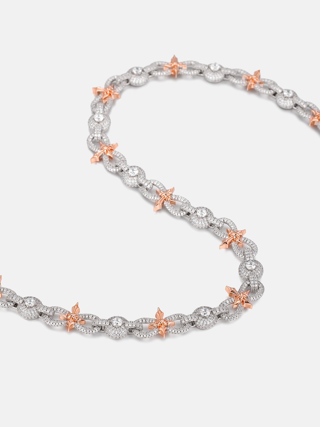 This 12MM chain combines rose gold-plated cross elegance with an iced-out infinity link featuring a radiant, oversized moissanite stone. Diamond-like brilliance meets timeless design in one stunning piece that works beautifully solo or layered.