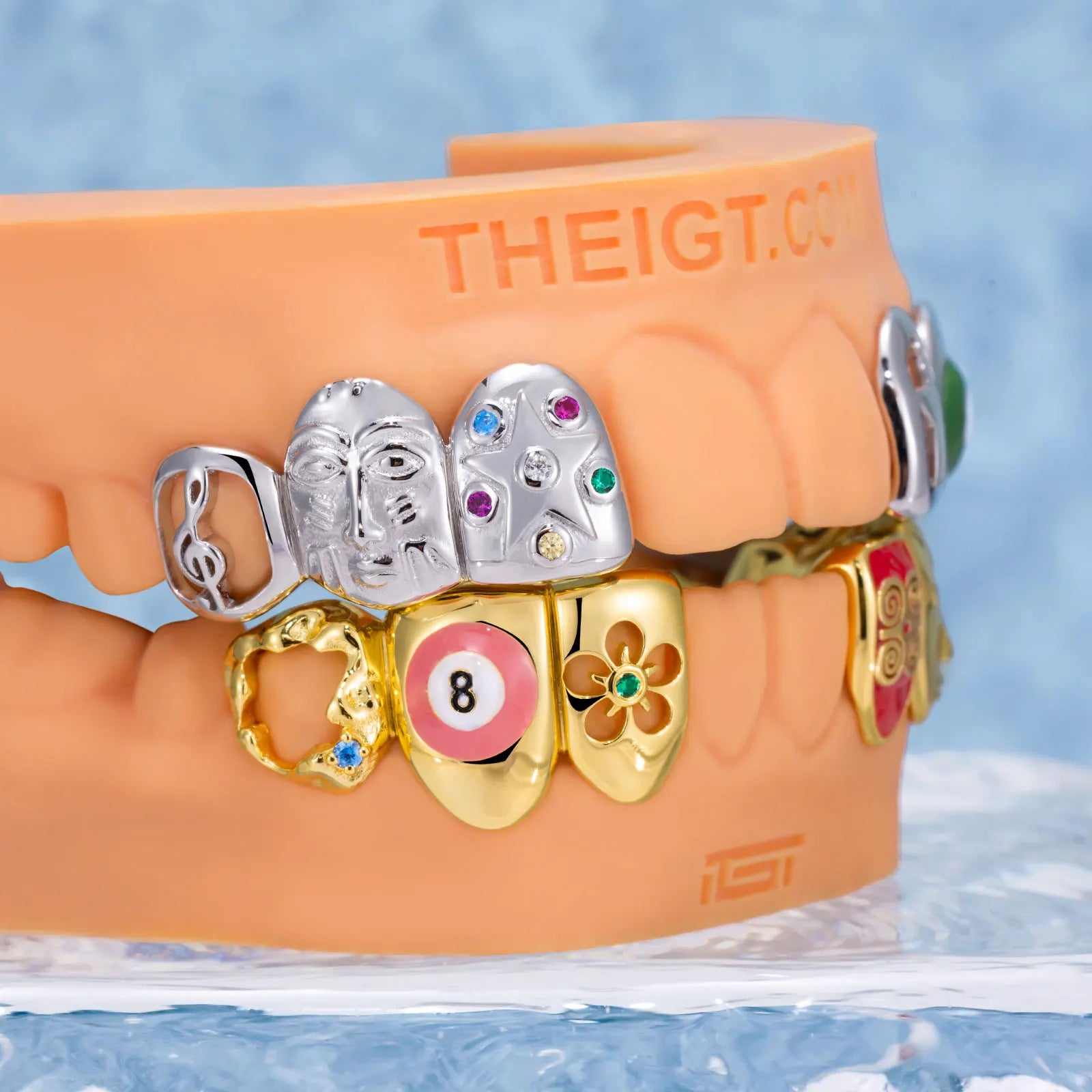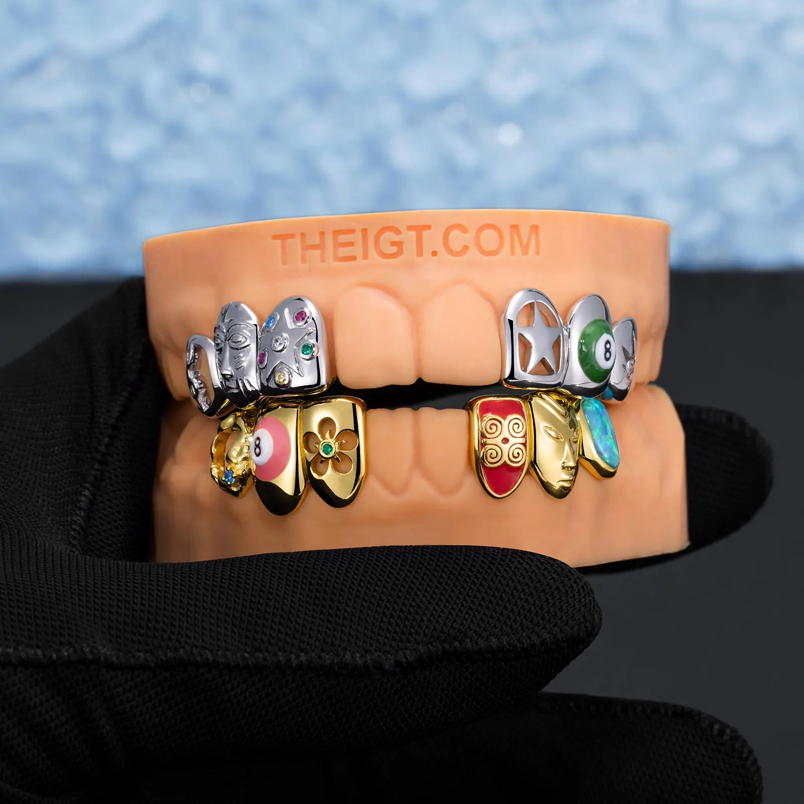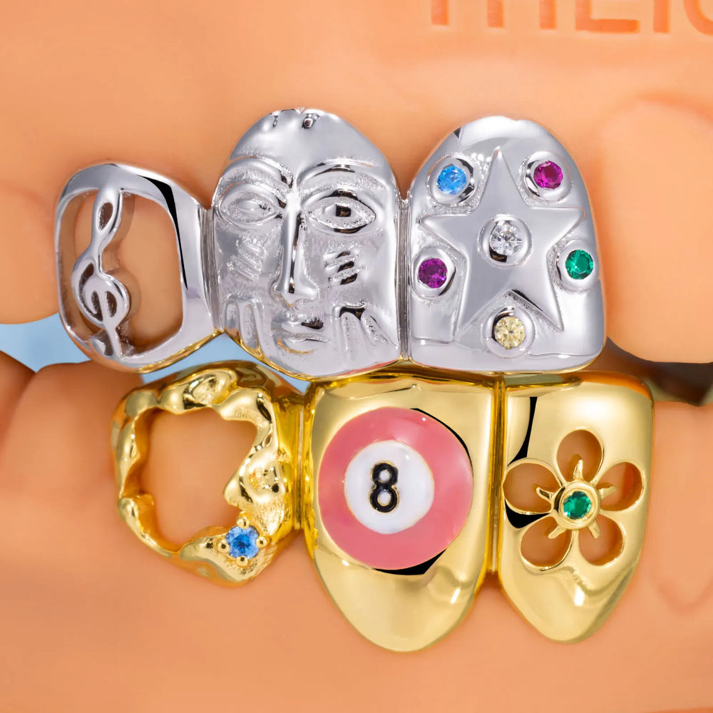 The Comsic Bowl 8 Grillz combines classic enamel, colorful gemstones, and opals in a striking design. Featuring motifs like the 8-ball, mask, flowers, and stars, each element blends seamlessly while keeping its unique character. This bold accessory adds artistic flair and individuality to your style, making a confident statement wherever you go.