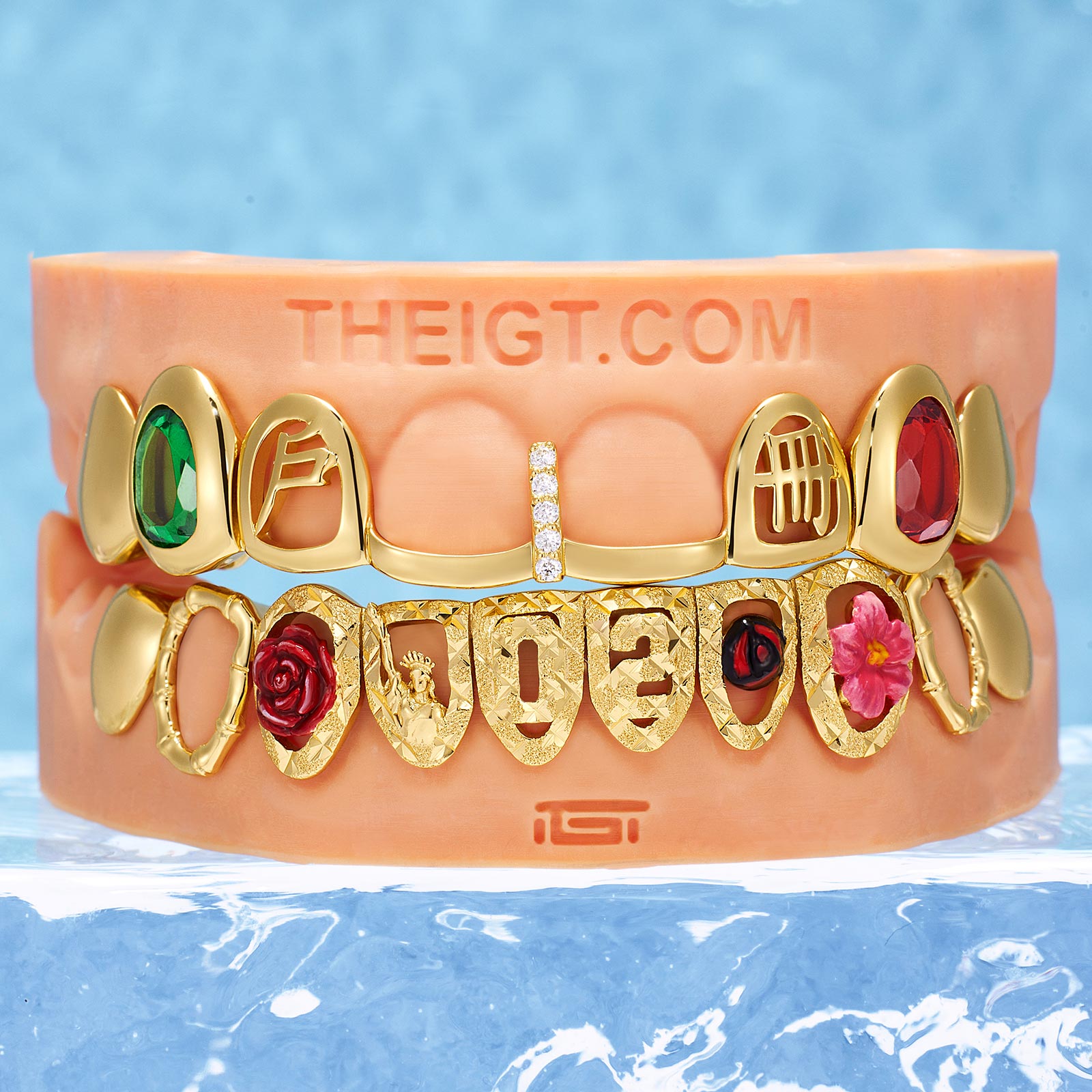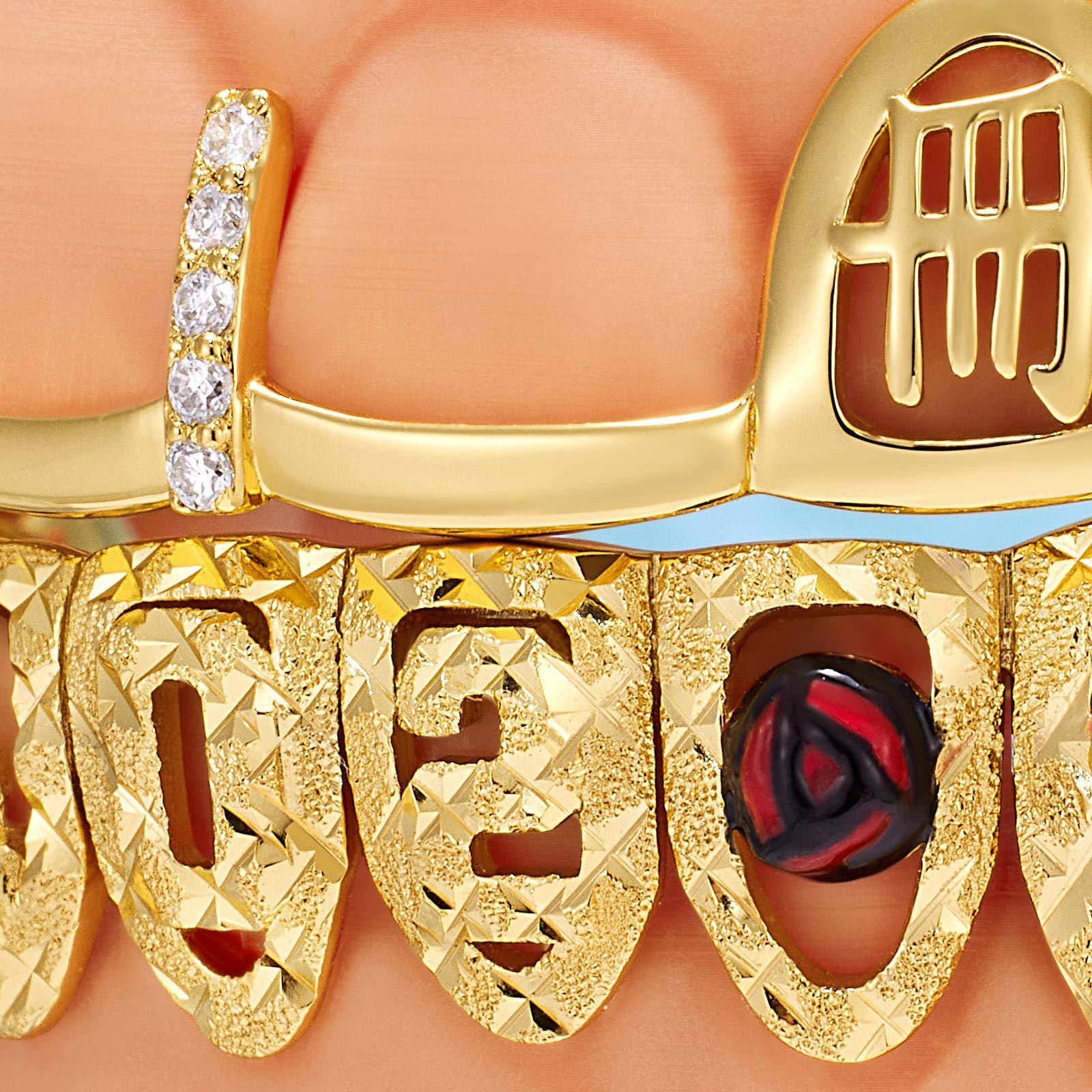 The Kanji & Liberty Cultural Icon Grillz blends global heritage with street luxury, featuring etched Kanji, the Statue of Liberty, and 3D floral accents hand-set in 14K gold over 925 sterling silver. This artistic set is the ultimate statement for VIP banquets, fashion parties, or a unique luxury gift for someone special. Perfect for music videos and gala events, it ensures a secure, custom-contoured fit with our included molding kit.