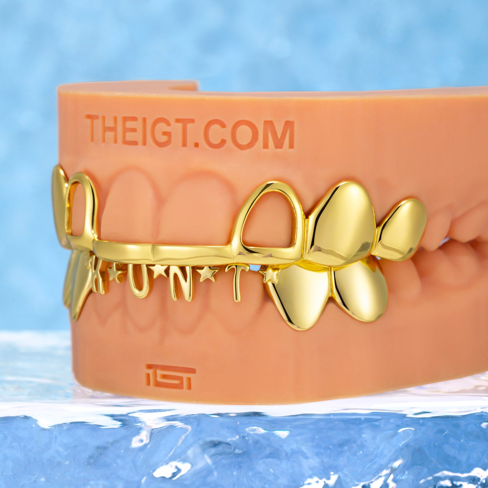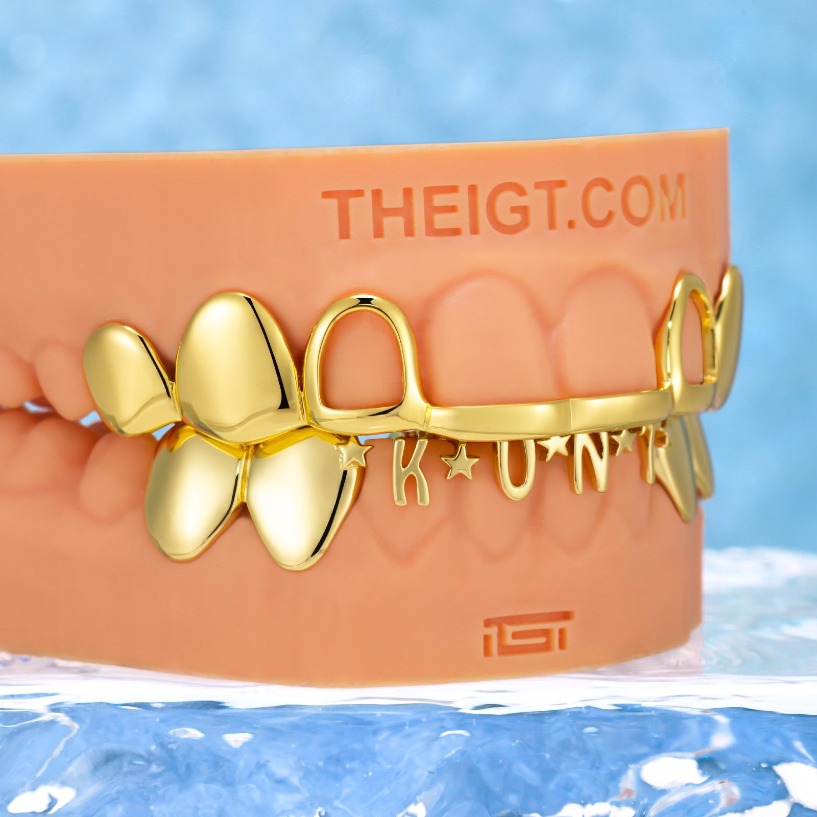 Shine with confidence in the KUNT Star Gold Grillz. This solid grillz piece features an open face and bridge top design paired with a custom five-star and KUNT letter bottom. No diamonds needed—pure gold brilliance that catches every light. Classic style meets personal edge.