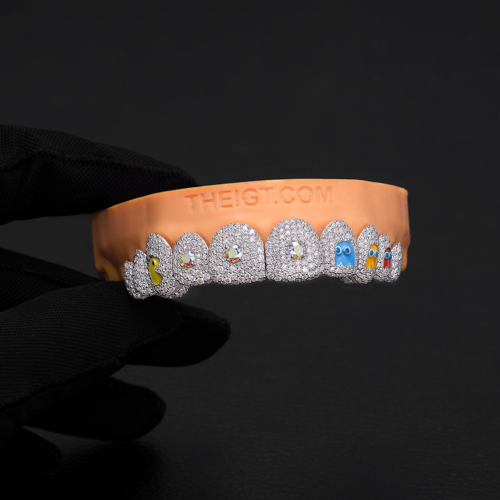 Elevate your smile with the Pac-Moissanite Chase Grillz, double iced out for an extraordinary sparkle. This playful design brings the classic arcade game to life with vibrant characters and a glittering trail of AB moissanite dots that catch the light with every move. Combining nostalgia and bold style, these grillz offer a fun and unique way to express yourself with dazzling brilliance.