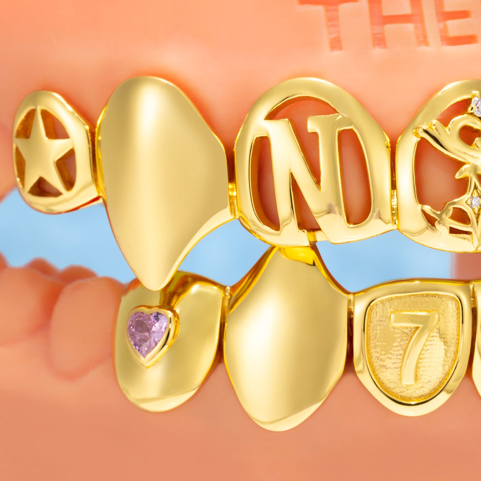 Pink Heart Opal Fusion Grillz combine romantic heart design with bold fangs and personalized engravings—a star, letters N and R, and the number 7. Crafted with white moissanite, Australian opal, and vibrant colored stones that sparkle from every angle. A striking statement piece that's unmistakably you.