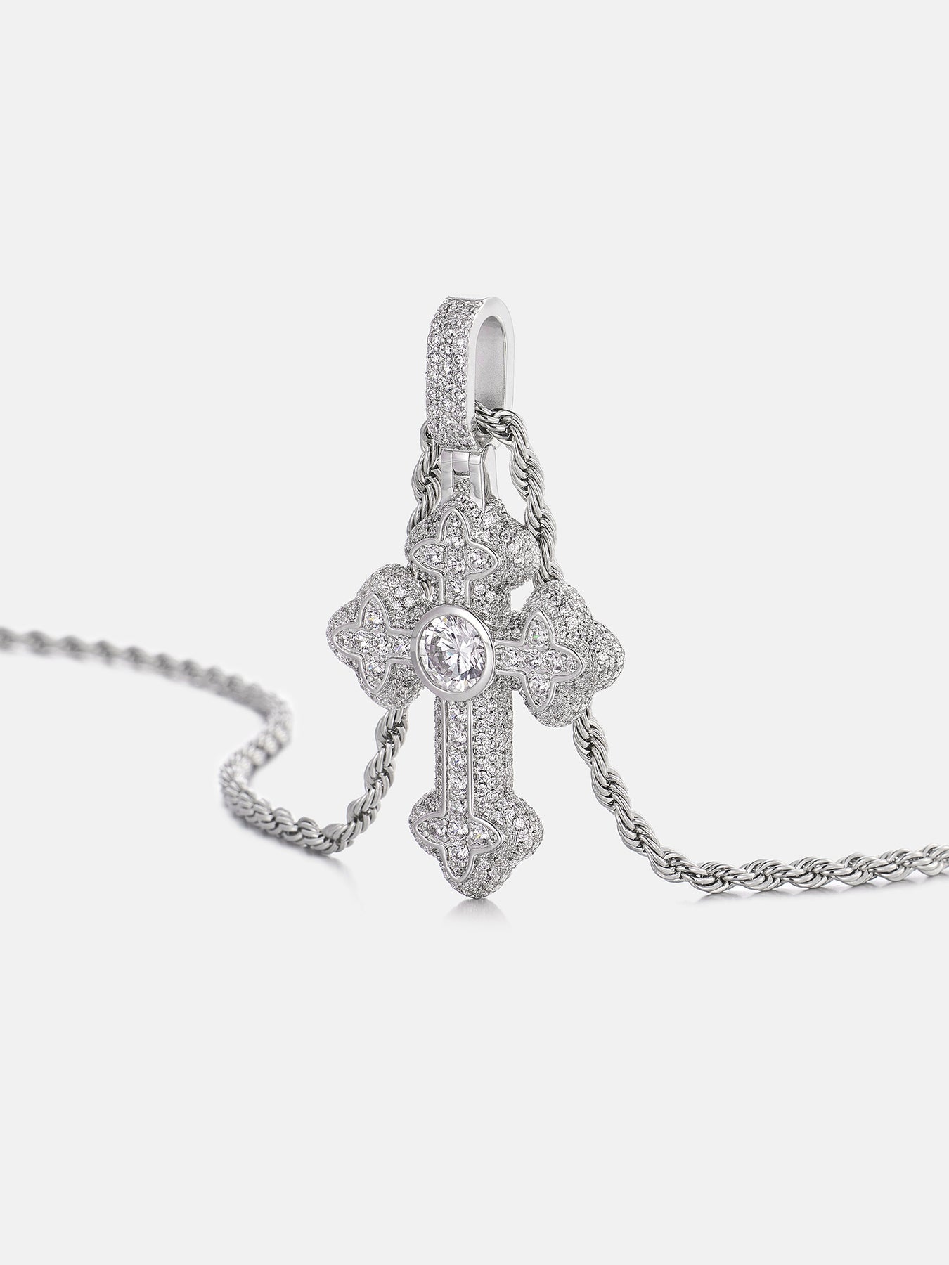 Silver cross pendant necklace on a white background