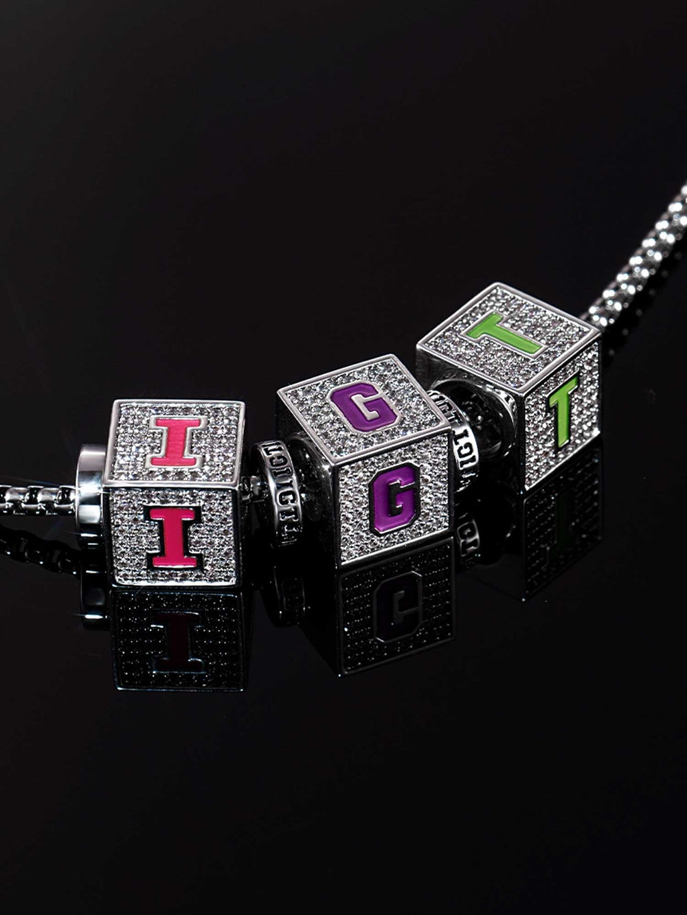 This piece is sure to turn heads. ICEGIANT has custom-engraved your name and mine in a dice-shaped pendant and secured it with carefully hand-set moissanite stones creating a stunning display of gleaming light from multiple angles. The letters boast a vibrant glow that ensures the dice will shine brilliantly in any light, day or night.