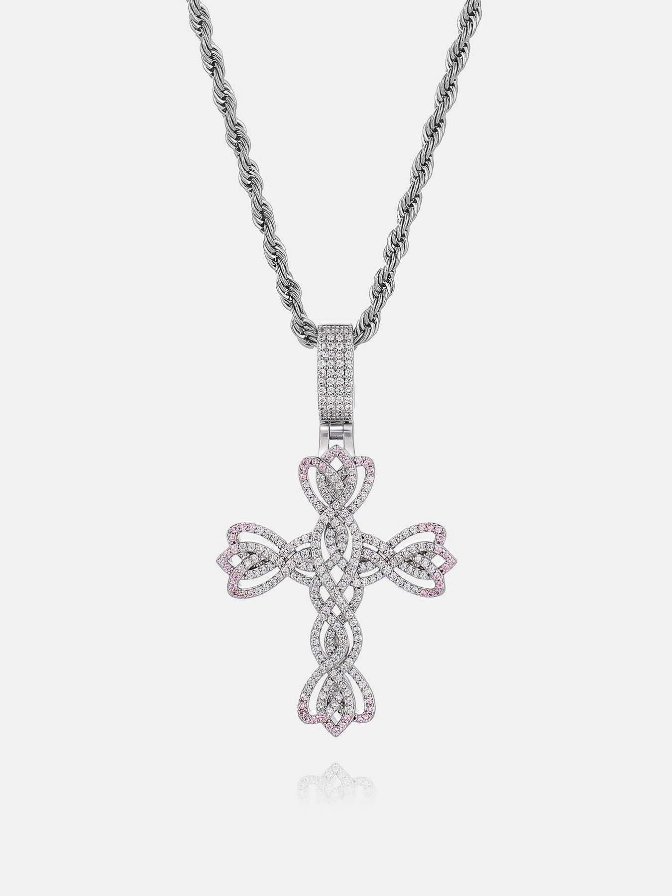 This striking cross pendant merges spiritual strength with delicate pink stones cradled in blooming florals. Each gem radiates hope and renewal, speaking boldly for those who wear faith with conviction. A powerful statement for the courageous—announce your transformation and unstoppable spirit.