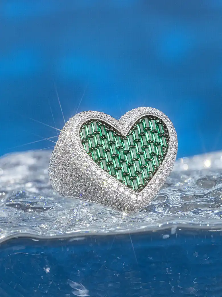 Transform your beloved into a glamorous one with our Made To Order Green Baguette CZ Heart Shape Ring. Crafted with exceptional brilliance and elegance, this masterpiece is gracefully accented with the finest ICEGIANT Green Baguette CZ, along with a Moissanite side-setting passing all tests. An enchanting accessory that is sure to become your loved one's favorite.