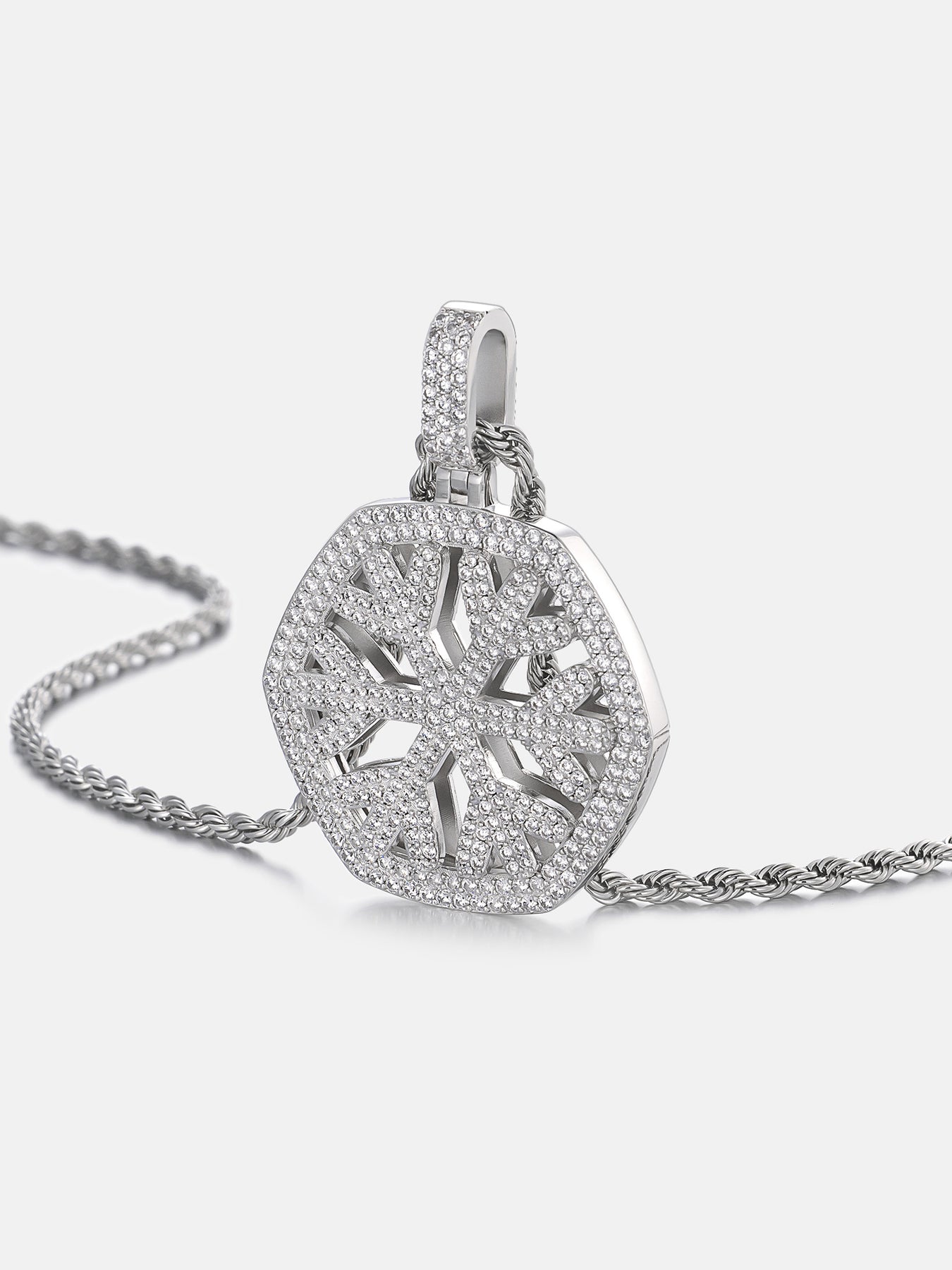 Capture the crystalline perfection of a winter landscape with our Hexagonal Crystal Moissanite Snow Pendant. This masterpiece features a meticulously detailed hexagonal snowflake silhouette, echoing the natural six-fold symmetry of a real ice crystal. Enclosed within a brilliant octagonal halo, the intricate lattice is fully pavé-set with D-color moissanite, creating a mesmerizing kaleidoscope of fire that transforms every movement into a flash of brilliance.