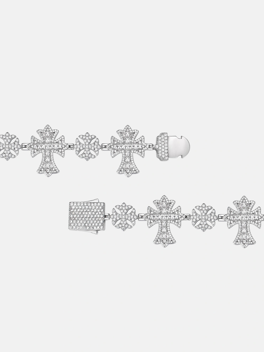 Elevate your style with our Mixed Size Moissanite Catholic Cross Bracelet. Featuring a stunning iCEGIANT design, this bracelet is available in various sizes for a perfect fit. Add a touch of elegance to any outfit and showcase your faith with this beautiful and versatile accessory.
