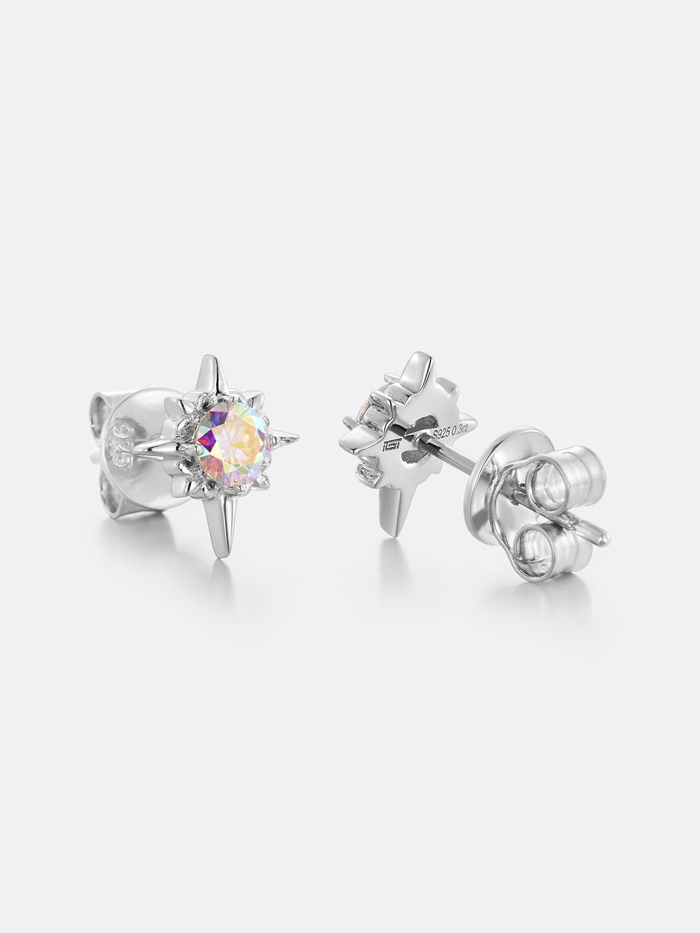 Discover vibrant sparkle with Rainbow Moissanite Eight-Pointed Star Stud Earrings. Their unique design and colorful brilliance make them a stunning highlight for any look.