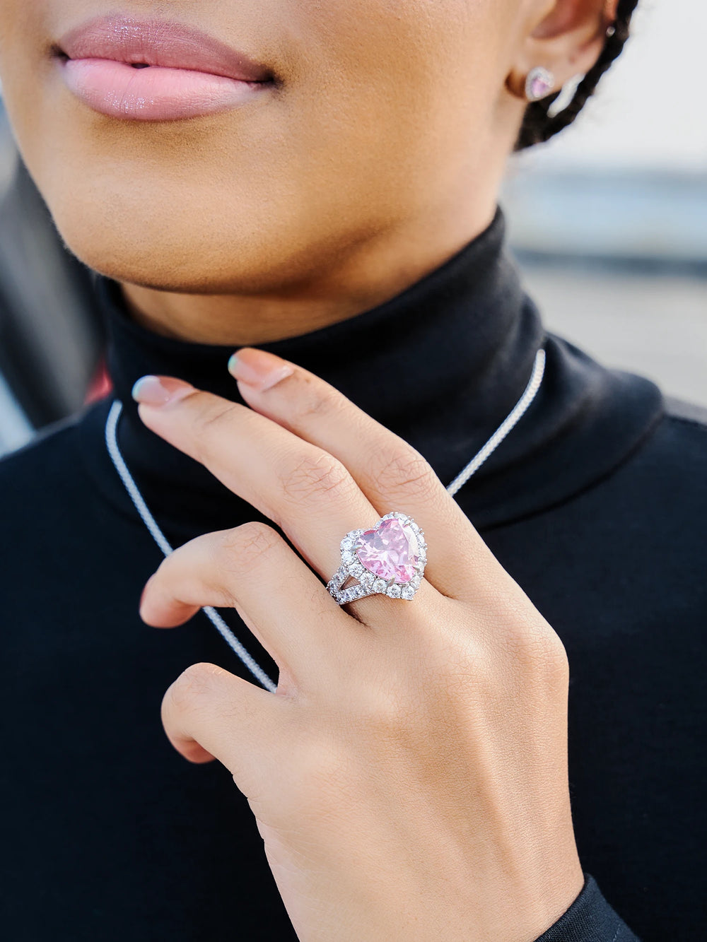 Take a risk with our iCEGIANT S925 Pink Gemstone Heart Shape Ring! The heart-shaped cut of the pink cubic zirconia is surrounded by pure moissanite, held firmly in place by four golden prongs. Let this bold and daring ring inspire you to embrace your adventurous side!
