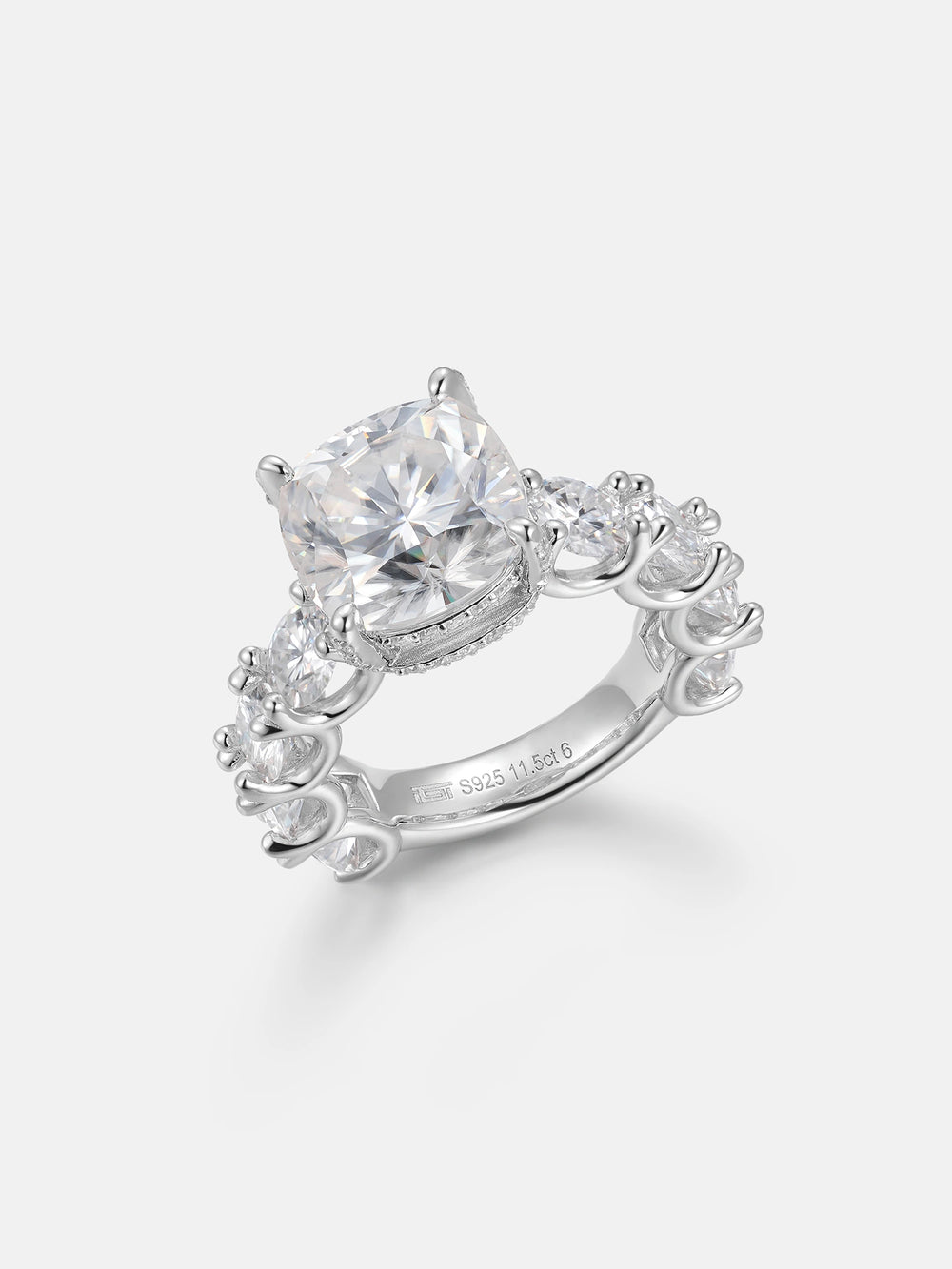 Experience the timeless elegance and beauty of our Cushion Cut Solitaire Moissanite Eternity Ring, featuring a stunning 11mm cushion cut center stone and a half circle of 3mm round moissanite accents. With its iCEGIANT technology, this ring is not only eternal but also breathtakingly radiant. Add a touch of luxury to any occasion.