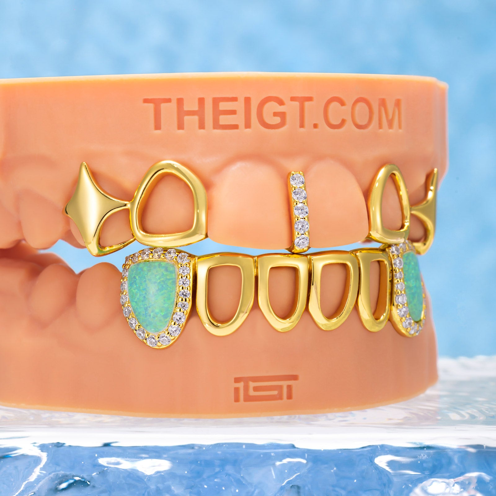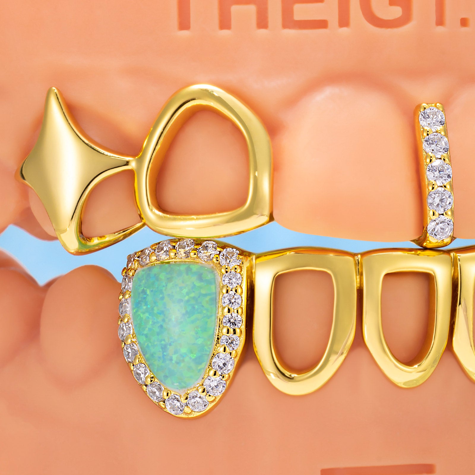 Gold Star Fangs & Opal Open Face Grillz Command attention with this open face grillz showcasing a plain star design iced with opal brilliance. The fang accents deliver bold edge while maintaining everyday wearability. A luxury statement piece for those with unmistakable style.