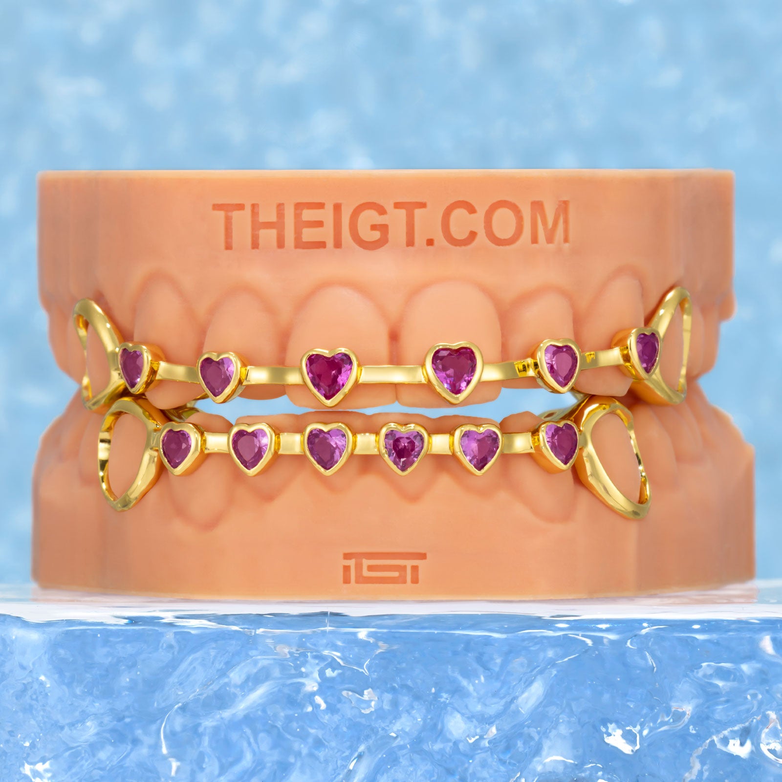 Wear your heart on your teeth with our Iced Heart Brace Style Grillz. This intricate design features a row of brilliant, pave-set hearts that deliver subtle yet undeniable sparkle. Perfect for making a unique, fashion-forward statement, this piece is a modern take on luxury. These custom-fit women's grillz teeth are crafted for those who want a softer look without sacrificing the drip.