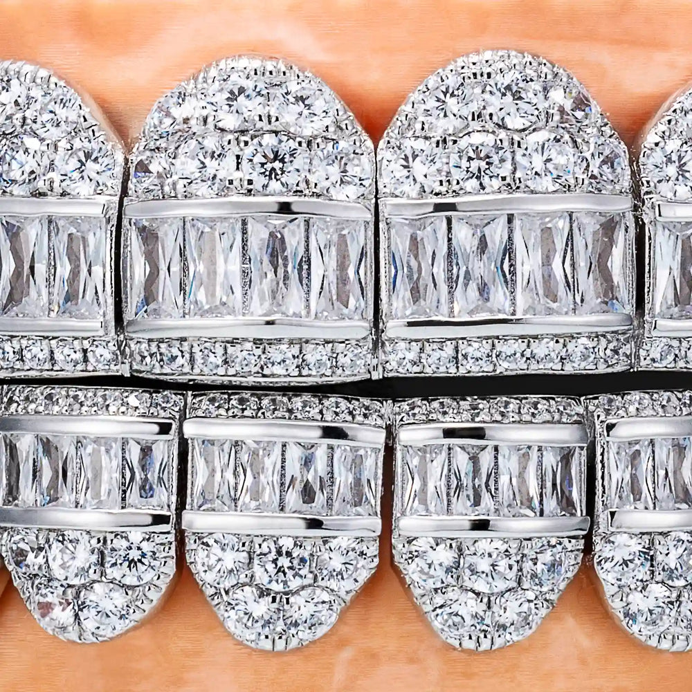Elevate your style with our pave setting hybrid moissanite diamond grillz. Handcrafted with high-quality round and emerald cut moissanite, adding a unique look on top and bottom fangs with pear and cross this custom-fit grillz will make you stand out. The perfectly weighted design ensures a comfortable fit. Turn heads and exude luxury with our must-have grillz.