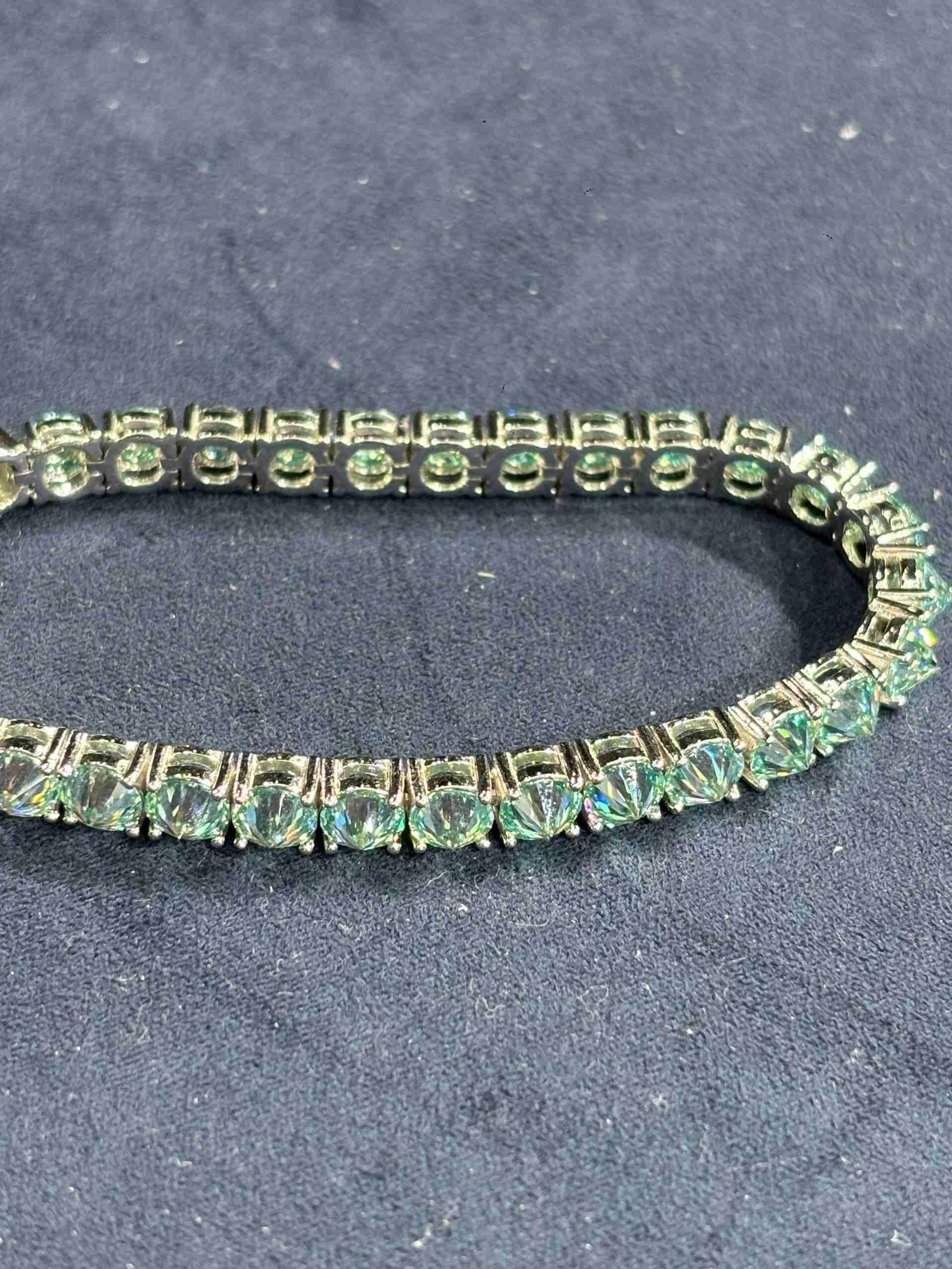 5mm Reverse-Set Blue Moissanite Tennis Bracelet Captivate with brilliant blue moissanite in this reverse-set tennis bracelet. The reverse-setting technique maximizes sparkle, letting light penetrate each 5mm stone for unmatched radiance. Durable, dazzling, and distinctly yours.