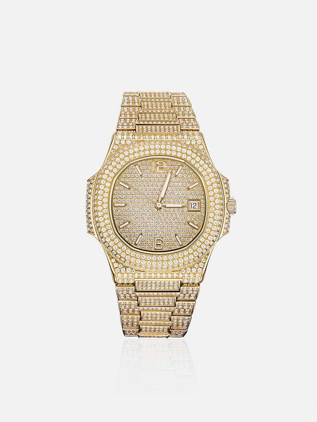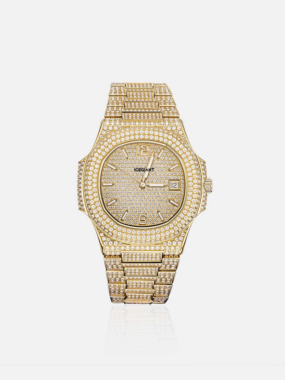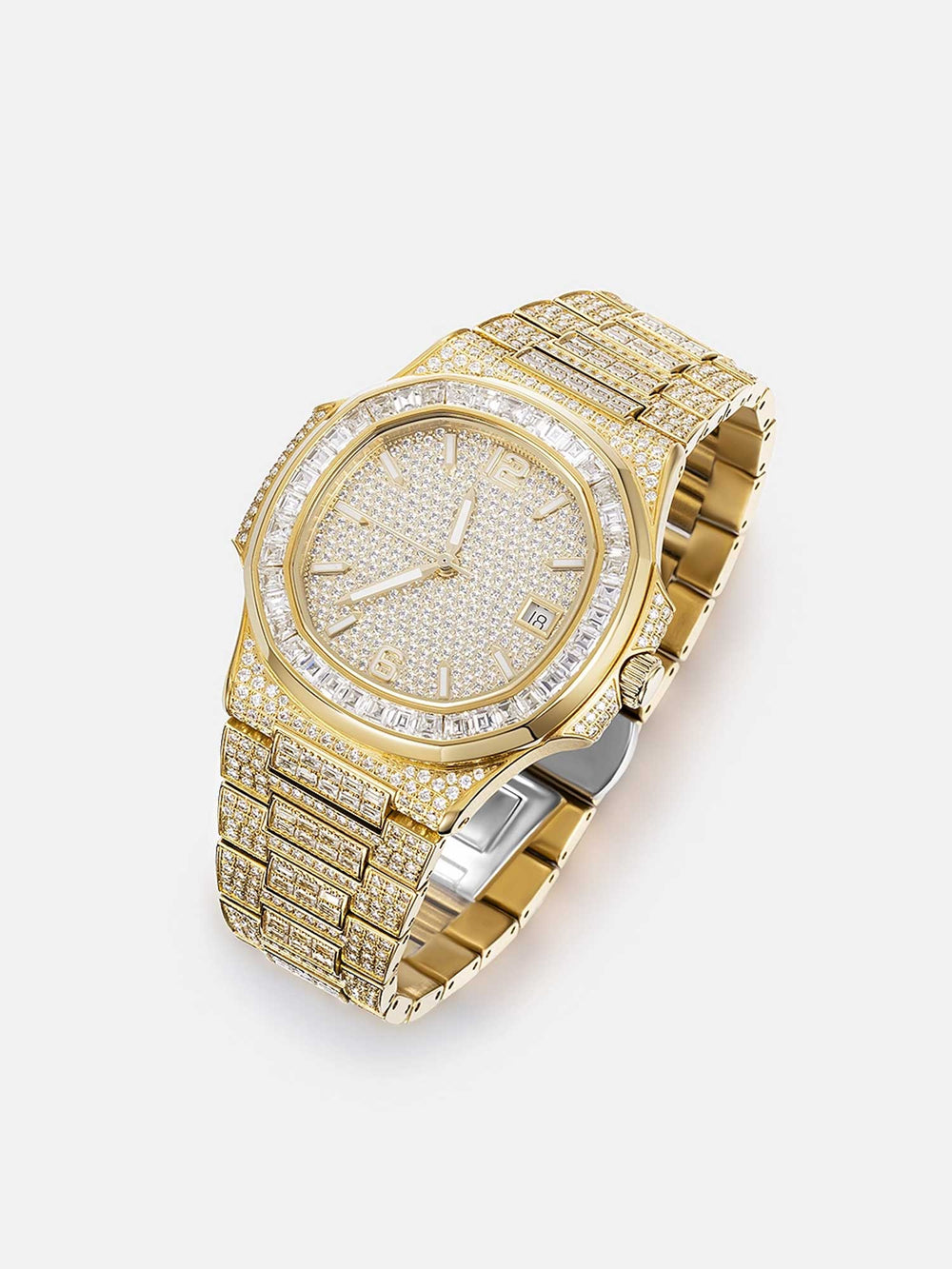 Fully Iced Out Moissanite Watch in Yellow Gold