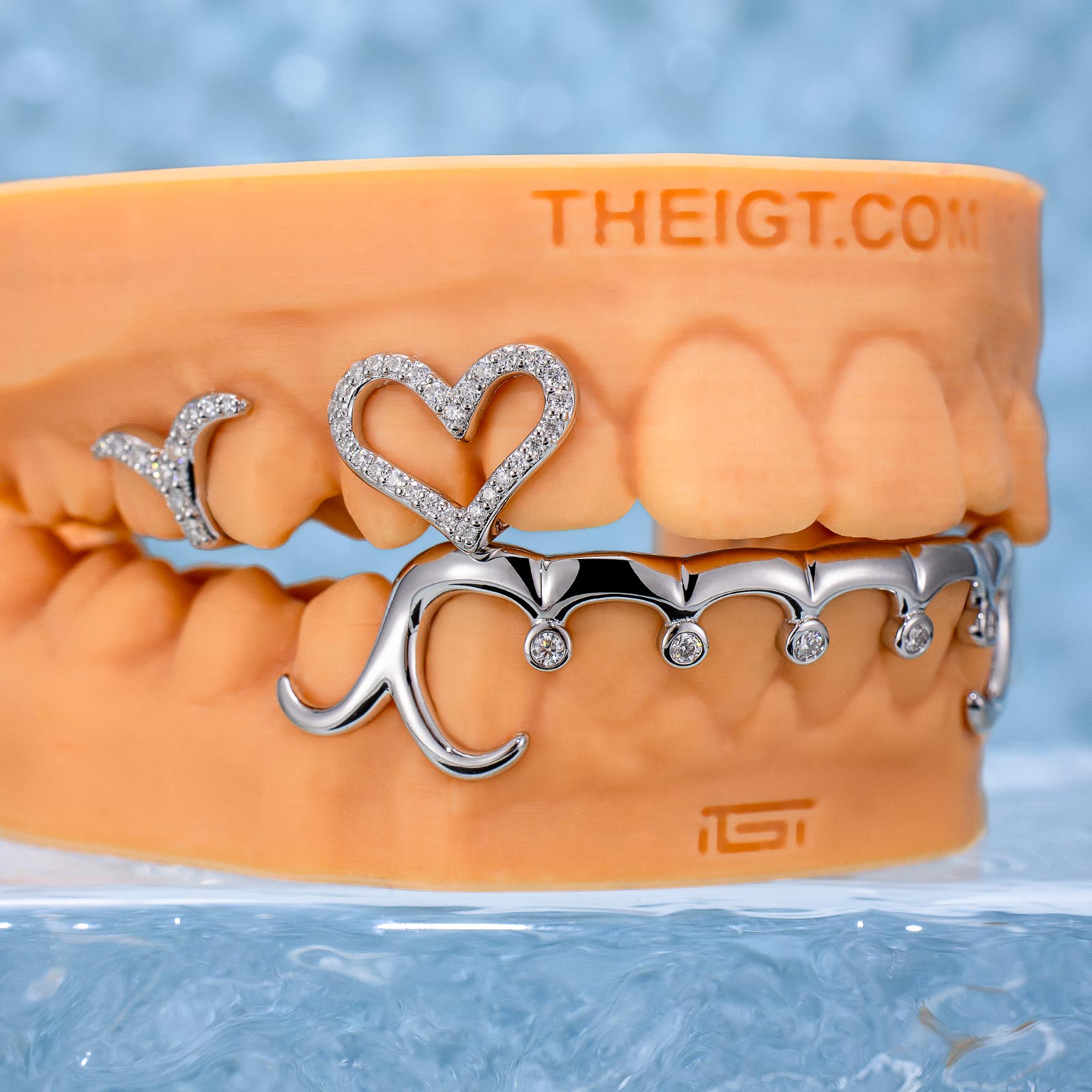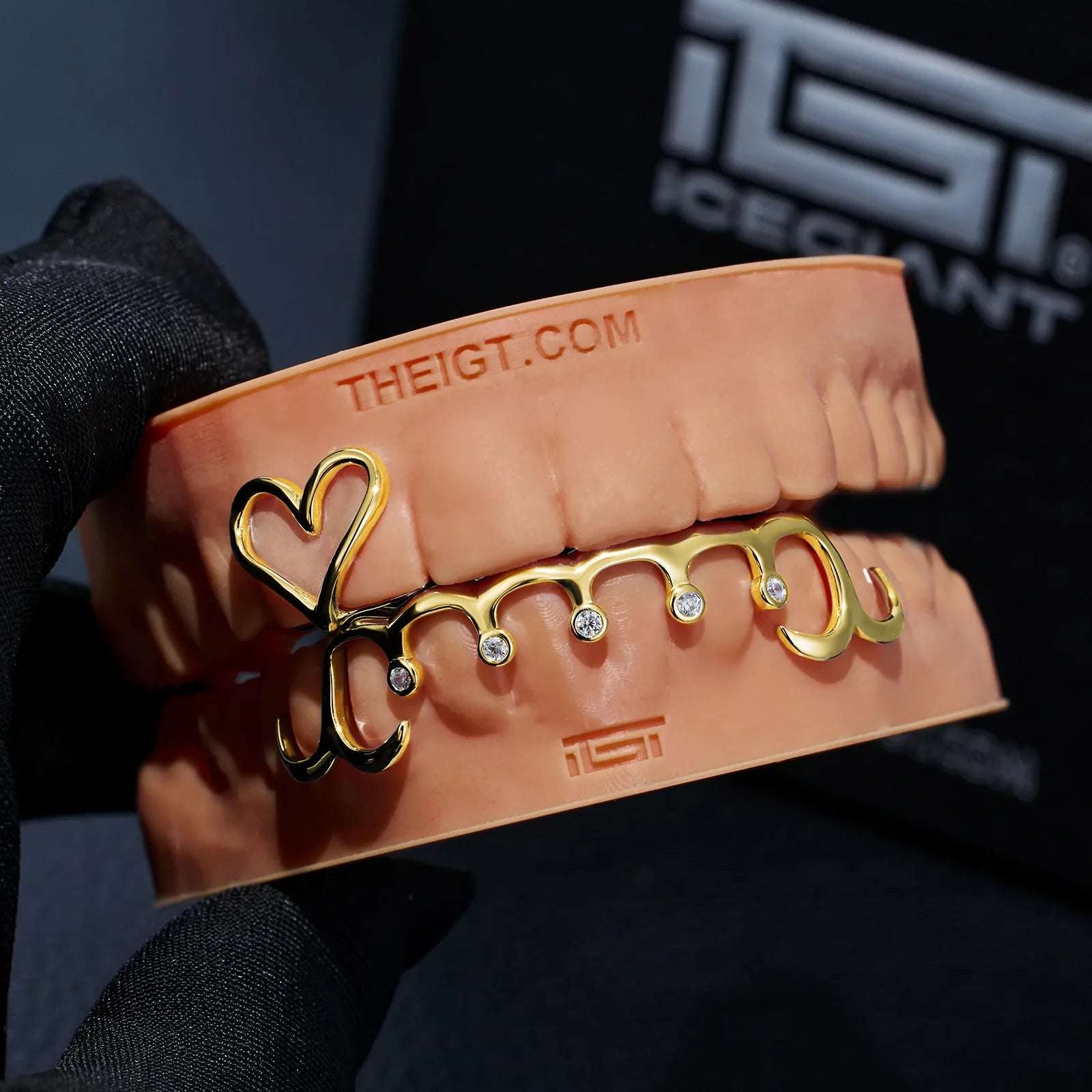 Drip with emotion. Our Diamond Heart & Wave Style Grillz offer a blend of personalized artistry and subtle sparkle. Featuring an elegant wave design accented with brilliant diamond stones and a custom heart cutout, this set is pure self-expression. They deliver the perfect subtle shine and clean aesthetic. These custom-made grillz on women provide a fresh, feminine take on high-end street jewelry.